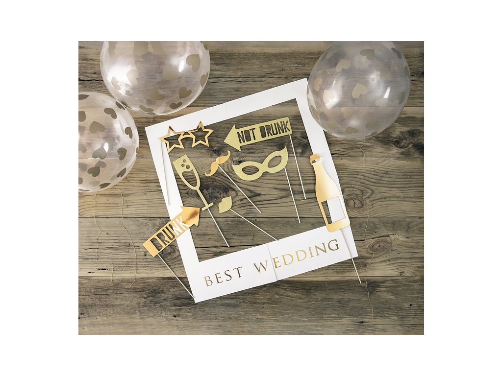 - conţine: 1x ramă (best wedding), 8x accesorii pe bâţ şi 3x baloane transparente