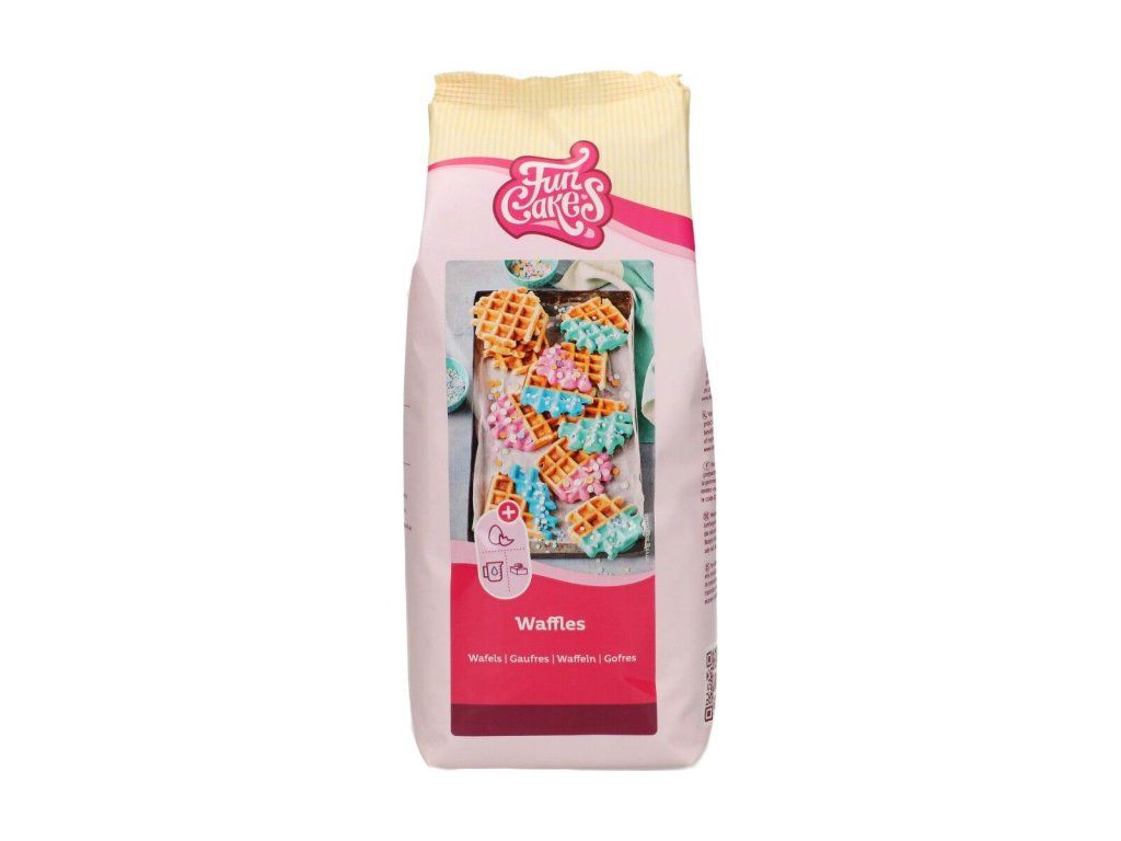 Procesați toate ingredientele la temperatura camerei. Folosește un mixer cu cârlige pentru a pregăti aluatul de vafe. Se amestecă 500 g din amestec, 150 g unt, 175 ml apă și 1 ou (50 g) și se amestecă aproximativ 3-4 minute până când aluatul este omogen. Se amestecă 200 g de zahăr granulat FunCakes cu 20 g de unt topit. Amestecați amestecul de zahăr și unt cu aluatul timp de 30 de secunde. Ungeți suprafețele fierului de vafe preîncălzit. Puneți aproximativ 70 g porții de aluat pe aparatul de vafe fierbinte (aluatul pregătit ar trebui să fie suficient pentru aproximativ 15 bucăți de vafe). Decorați vafele răcite cu frișcă sau fructe după preferințe.