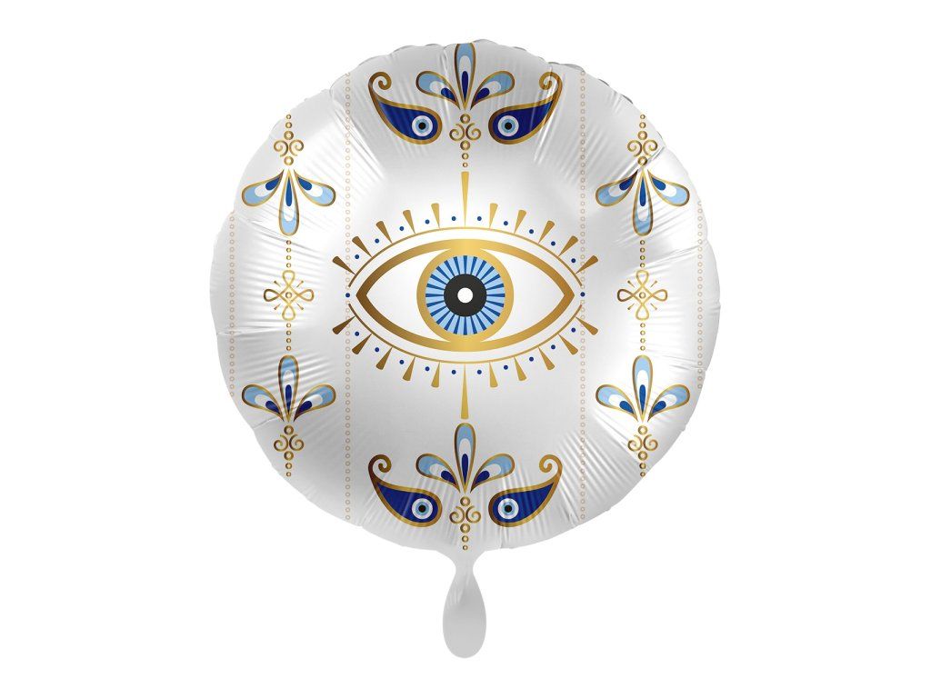 Acest balon din folie rotund cu motiv de ochi protector este un accesoriu original pentru orice petrecere sau interior. Datorită designului său distinctiv și luciului metalic, atrage atenția de la prima vedere.
