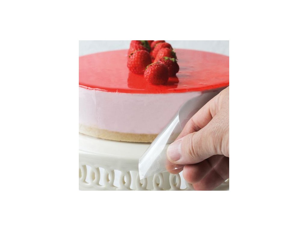 Bandă tort folie transparentă lățimea 8 cm - lungimea 20 m permite margini netede ale torturilor cu crema si cheesecake-urilor să se stabilizeze dar este potrivita si pentru lucrul cu ciocolata. Banda pentru torturi este sigură pentru alimente și ușor de tăiat în lungimi diferite.