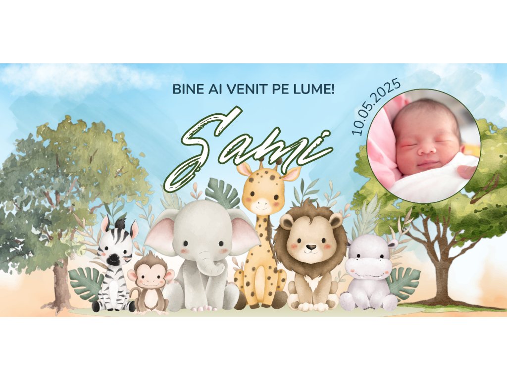 Cu un banner în stil safari, veți aduce petrecerii de bun venit pentru bebeluș o atmosferă jucăușă și plină de afecțiune, plină de aventură! Este suficient să adăugați o fotografie a bebelușului (de exemplu, de la ecografie), eventual numele și data nașterii – și momentul unic de întâmpinare poate începe. Acest banner personalizat este alegerea perfectă pentru părinții care iubesc natura, animăluțele și stilul original.