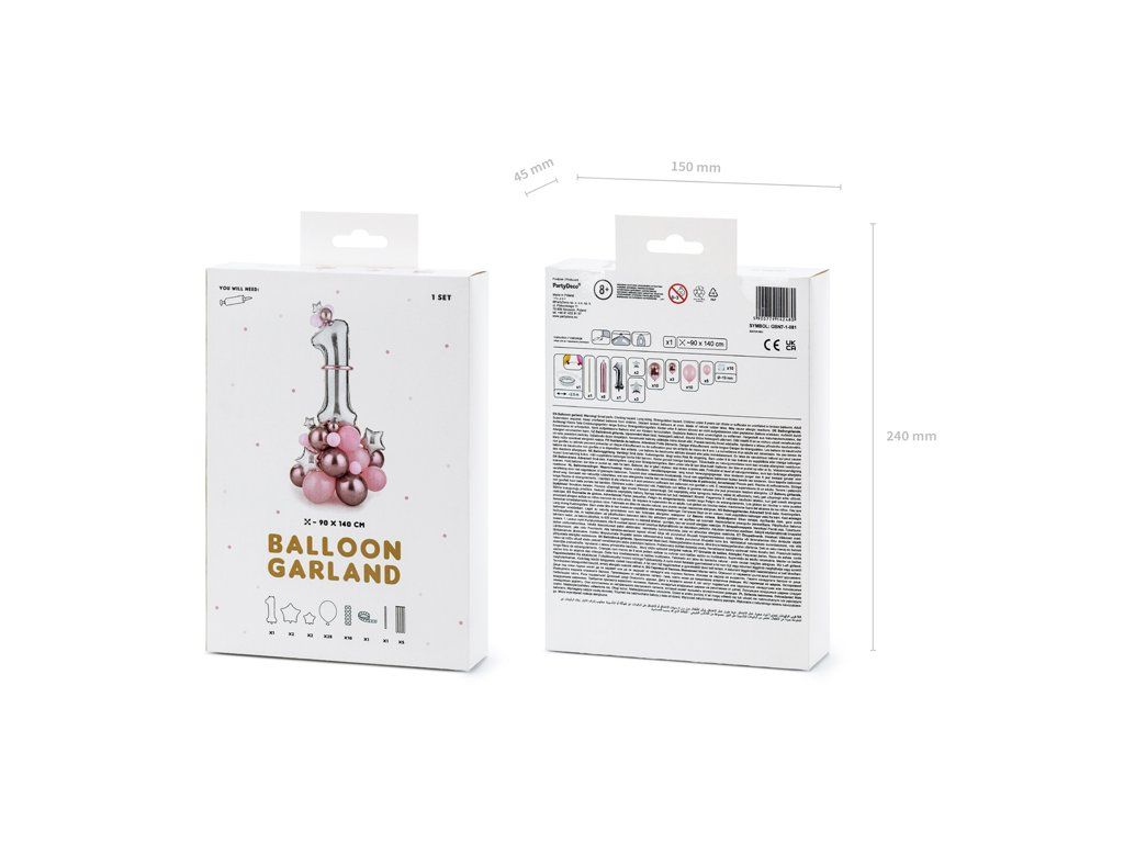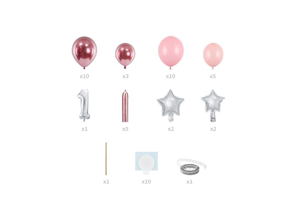 - conține: 28 x baloane (roz pastel și roz crom), 10 x bandă de spumă, 5 x baloane de modelare, 1 x balon din folie nr.1, 4 x baloane din folie stea, 1 x paie, 1 x ghirlandă de baloane