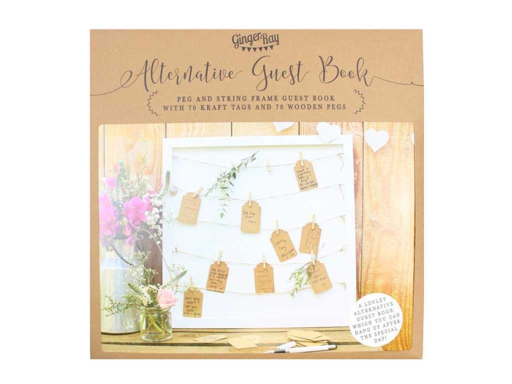 Cadru din lemn cu sfoară naturală, cleștișori și carduri pe care fiecare dintre invitați își scrie urările pentru tinerii căsătoriți. Această carte de oaspeți de nuntă originală pur și simplu nu vă va plictisi și chiar și peste ani vă va plăcea să citiți mesajele și felicitările de la prieteni și familie.