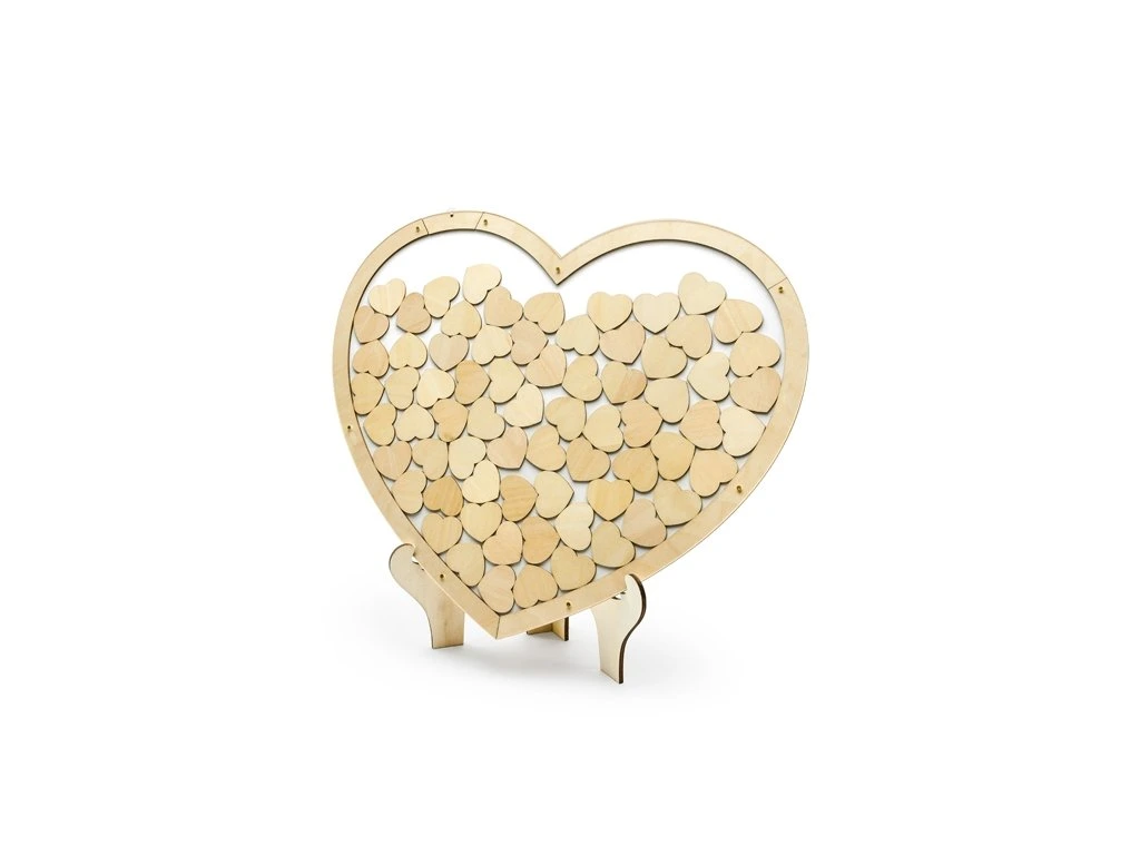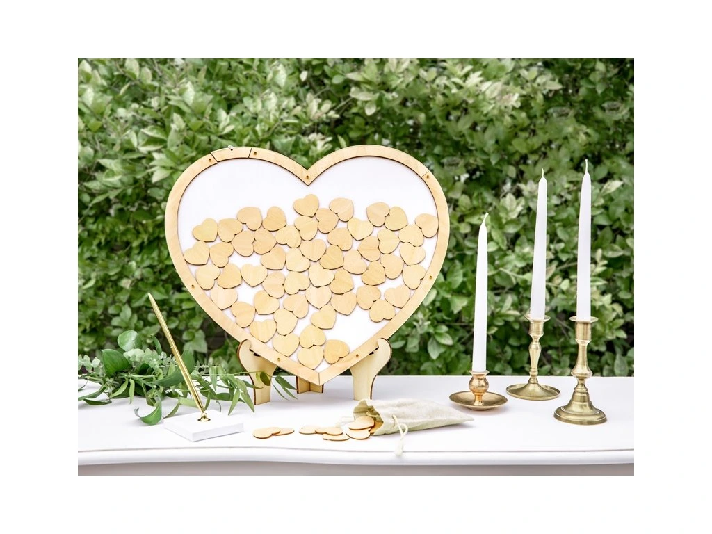Această Carte pentru oaspeti într-o versiune de lemn în formă de Inimă, vă înfrumusetează ziua nuntii. Cartea contine 70 buc de inimă, pe care oaspetii se pot semna.