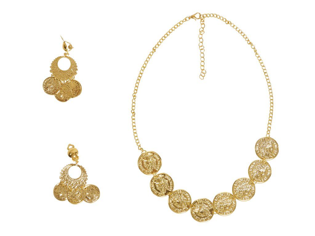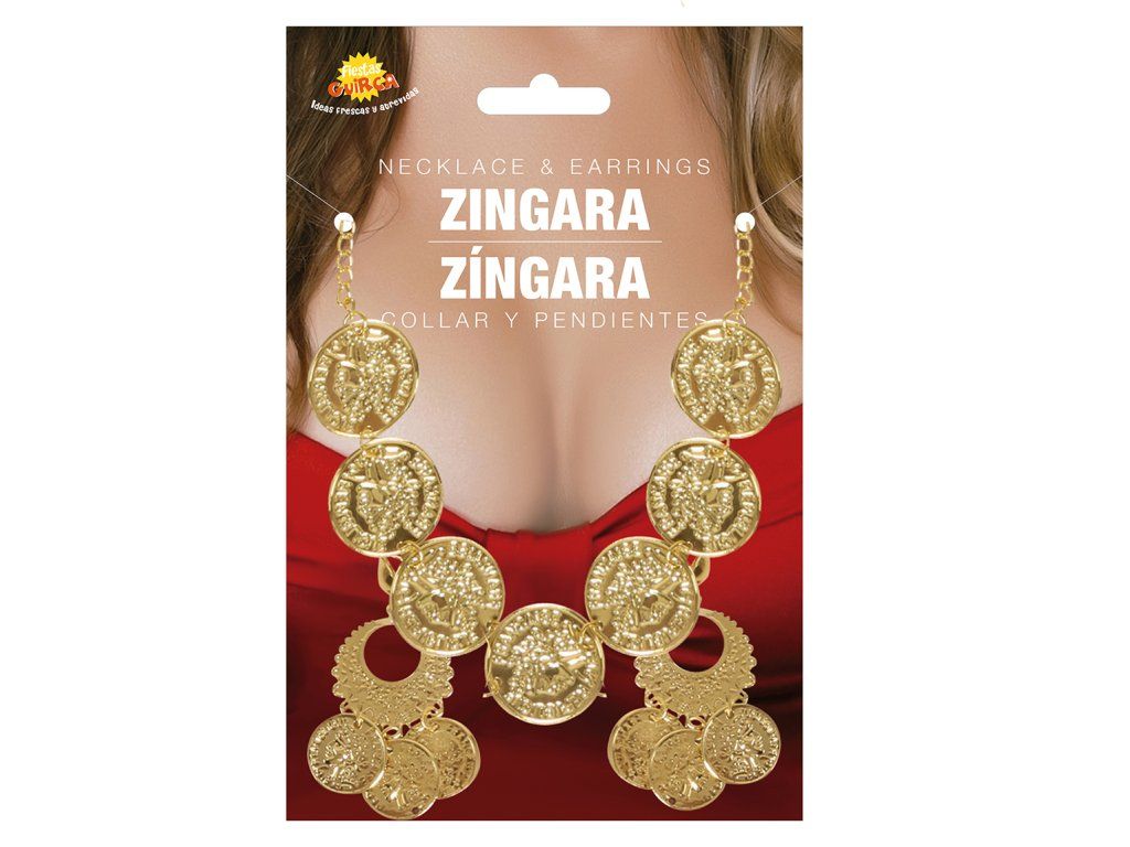 Costumul de Halloween sau carnaval, poate fi mai credibil si datorită diferitelor accesorii cum este acest colier cu cercei din monede. Acest accesoriu se potriveste pentru diferite costume pentru carnaval cu tematică tigănească, bineînteles lăsăm totul la decizia imaginatiei voastre.