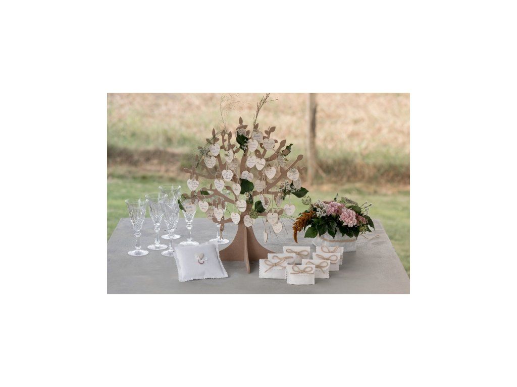 Copacul de dorințe din lemn este un decor original și plin de imaginație pentru recepția de nuntă. Acesta poate servi ca o carte de oaspeți, unde invitații scriu dorințele pentru tinerii căsătoriți pe inimioare atârnate de copac. Copacul cu dorințe vă va lăsa amintiri frumoase din ziua nunții. Și pe lângă faptul că este un decor frumos, este și o idee originală pentru nunta ta. Acesta vă va aminti și peste ani de cea mai frumoasă zi din viața voastră.