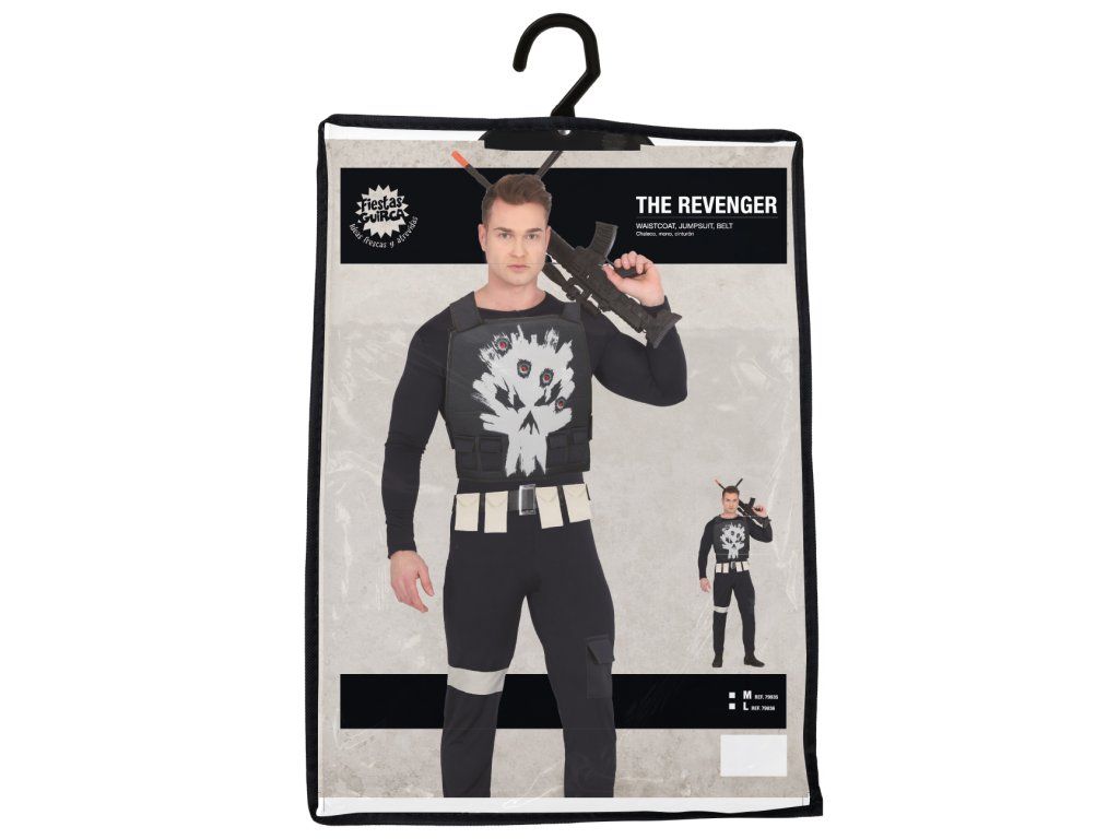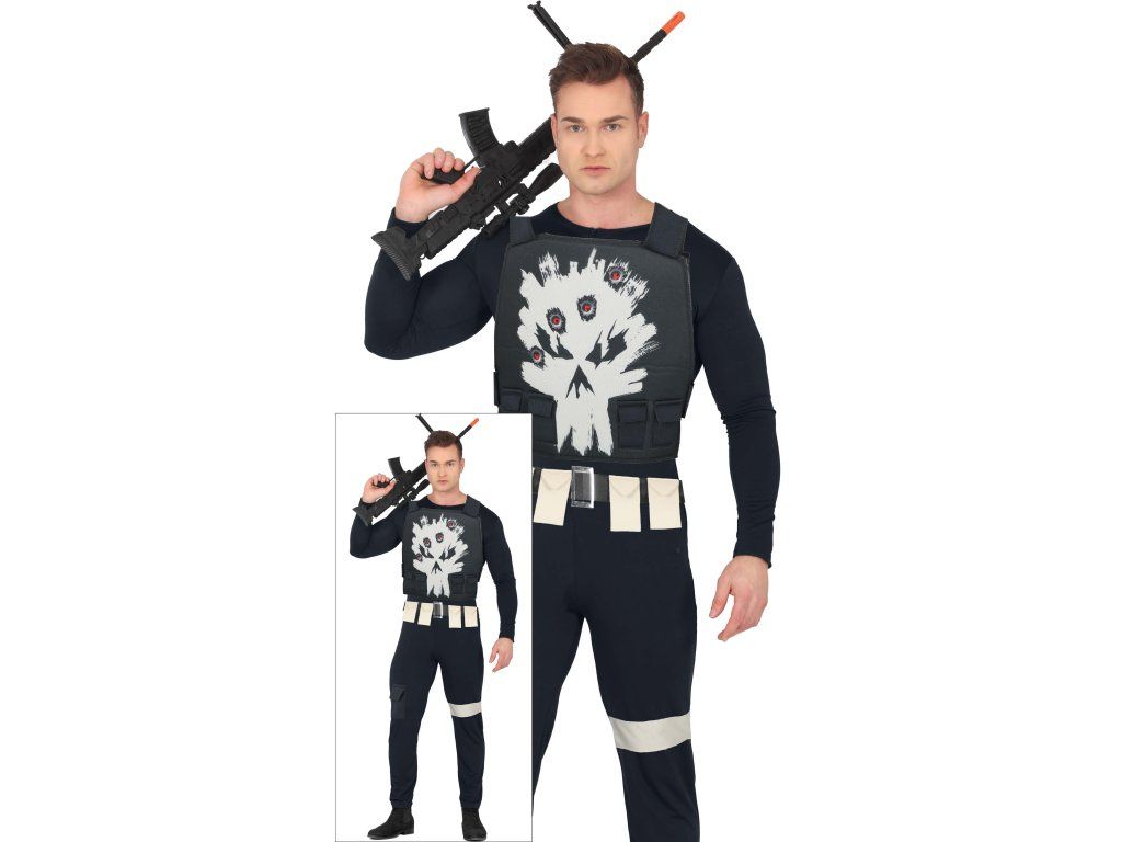 Pregătește-te pentru acțiune! Cu acest costum bărbătesc Punisher vei deveni eroul de neuitat al oricărei petreceri, carnaval sau serată tematică.