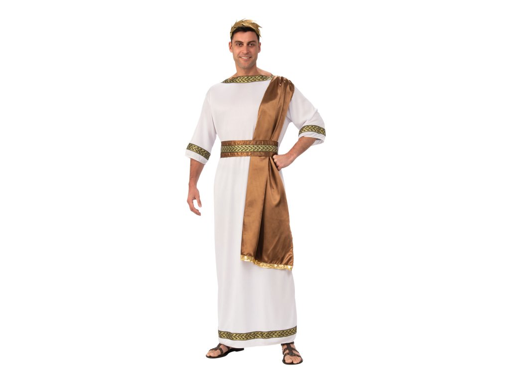 Acest costum bărbătesc este ca o teleportare direct în vechiul Olimp. Costumul conține o tunică albă cu bordură elegantă aurie, realizată din poliester ușor și respirabil. Include o curea stilată și o coroniță de laur, care vă va face imediat recunoscut drept stăpânul tunetelor, al vinului sau al petrecerilor. Costumul este conceput să se potrivească mai multor tipuri de siluetă. Tot ce trebuie să faceți este să adăugați sandale și un zâmbet divin și sunteți gata pentru orice petrecere, carnaval sau olimpiadă corporate. Cu acest costum veți ieși cu siguranță în evidență și poate veți câștiga și câțiva admiratori muritori!