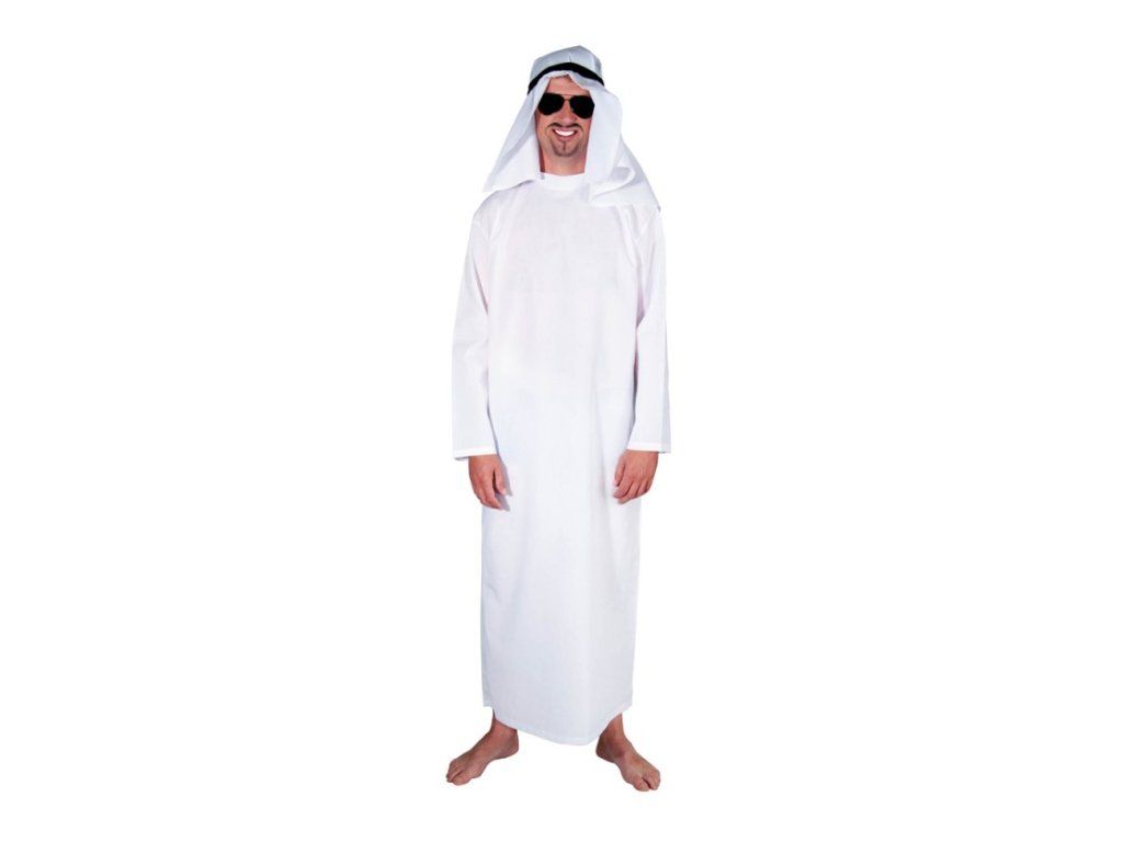 Costumul include: un overall tip tunică albă din material ușor și respirabil, care îți va asigura confortul chiar și când dansezi în deșert. Setul include și o eșarfă elegantă alb-negru pentru cap cu o bandă neagră – pentru un look autentic de șeic.