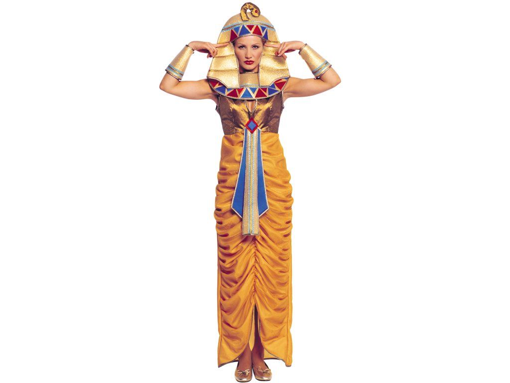 Costumul Cleopatrei este plin de detalii care fac referire la cultura egipteană. Rochia aurie, gulerul distinctiv și brățările masive creează o impresie de autenticitate și rafinament.