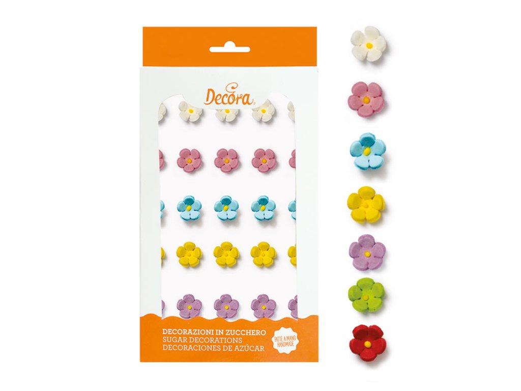 Cukrové zdobenie Kvietky vo farbách sú tradičným zdobením dámskych, dievčenských jemných a hravých tort alebo zákuskov. Vyniknú a ozvláštnia cupcakes, muffins,cookies alebo krémové koláčiky.
