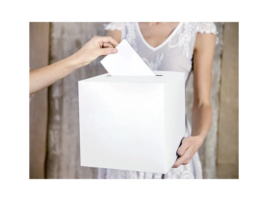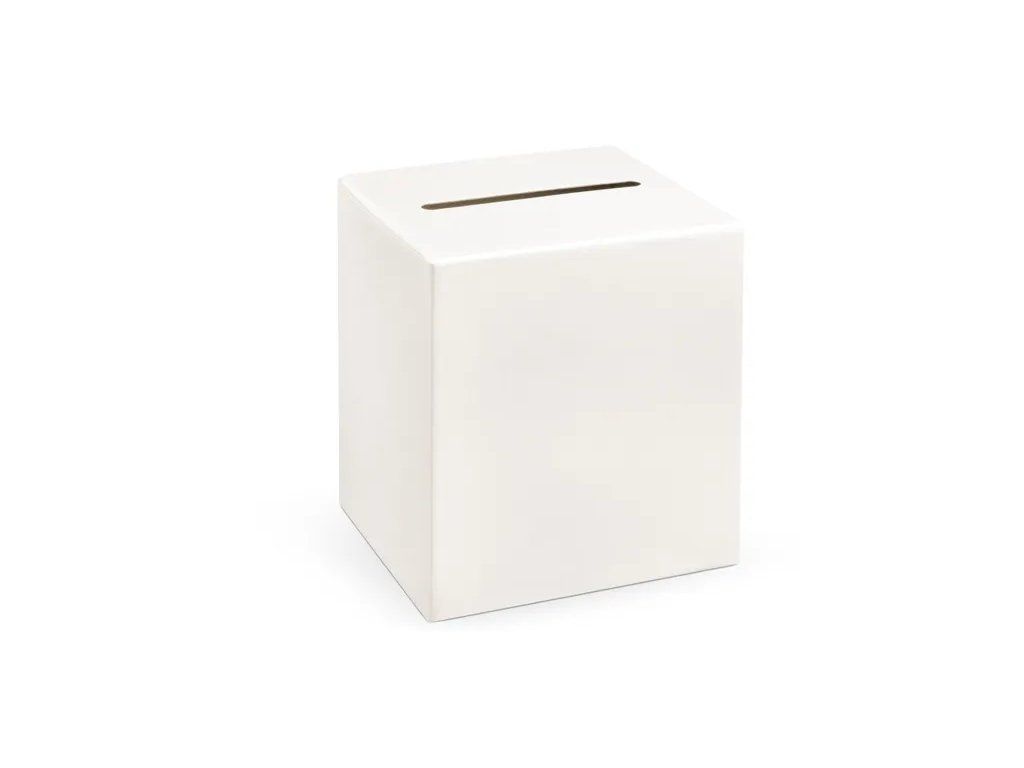 Această cutie pentru plicuri sau bani nu doar că va completa decorul, dar vă va ajuta și să păstrați micile atenții primite de la invitați. Cutia de plicuri pentru nuntă este din hârtie metalizată de culoare crem, cu un orificiu pentru inserarea felicitărilor. Cutia se asamblează ușor și poate fi plasată într-un loc vizibil la petrecerea dvs.