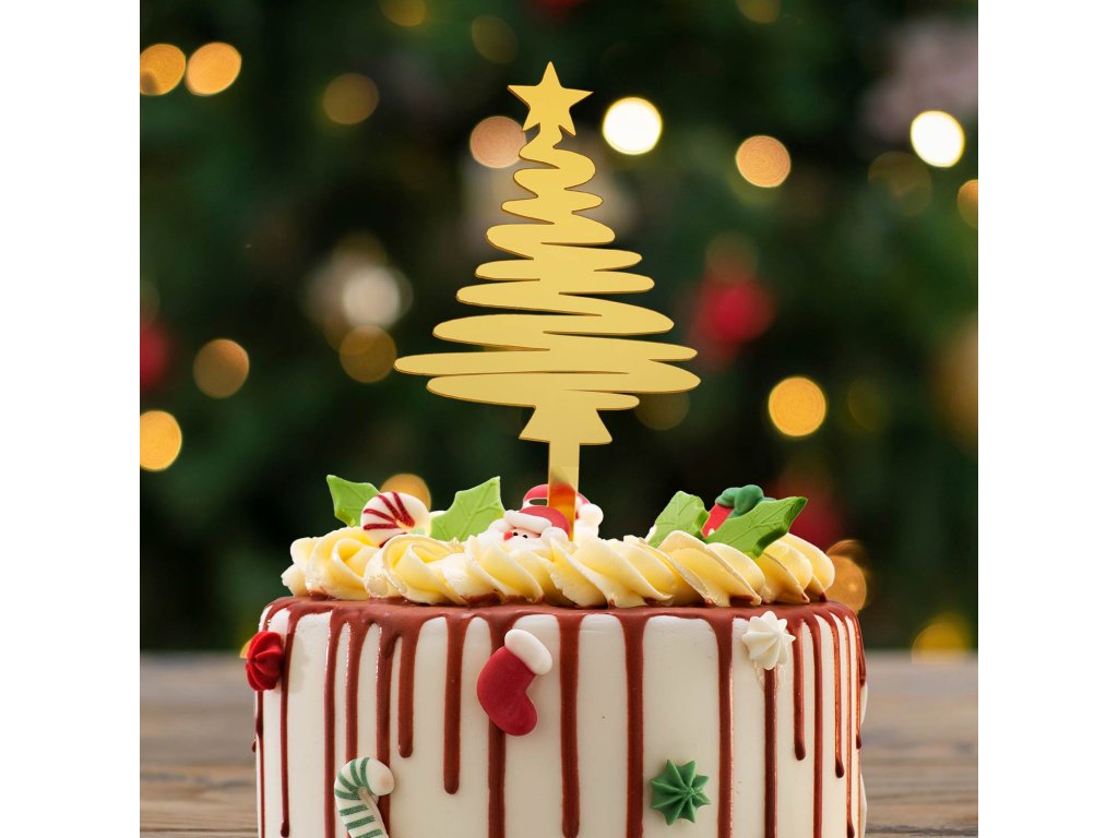 Fă-ți tortul să strălucească de sărbători! Acest decor în formă de brad de Crăciun, într-o nuanță elegantă de auriu, este îmbunătățirea tehnică perfectă pentru orice petrecere de Crăciun.