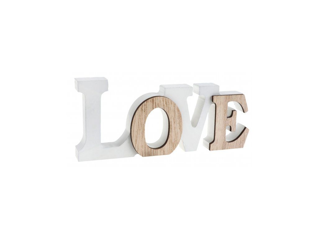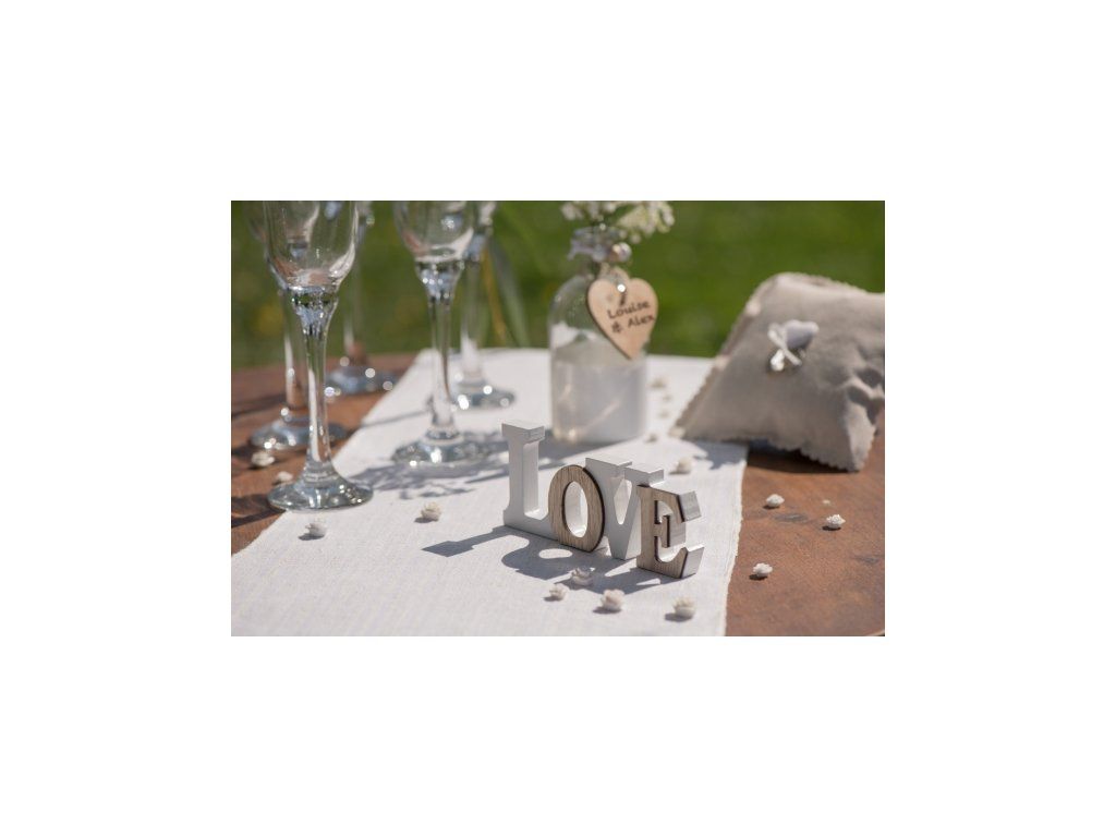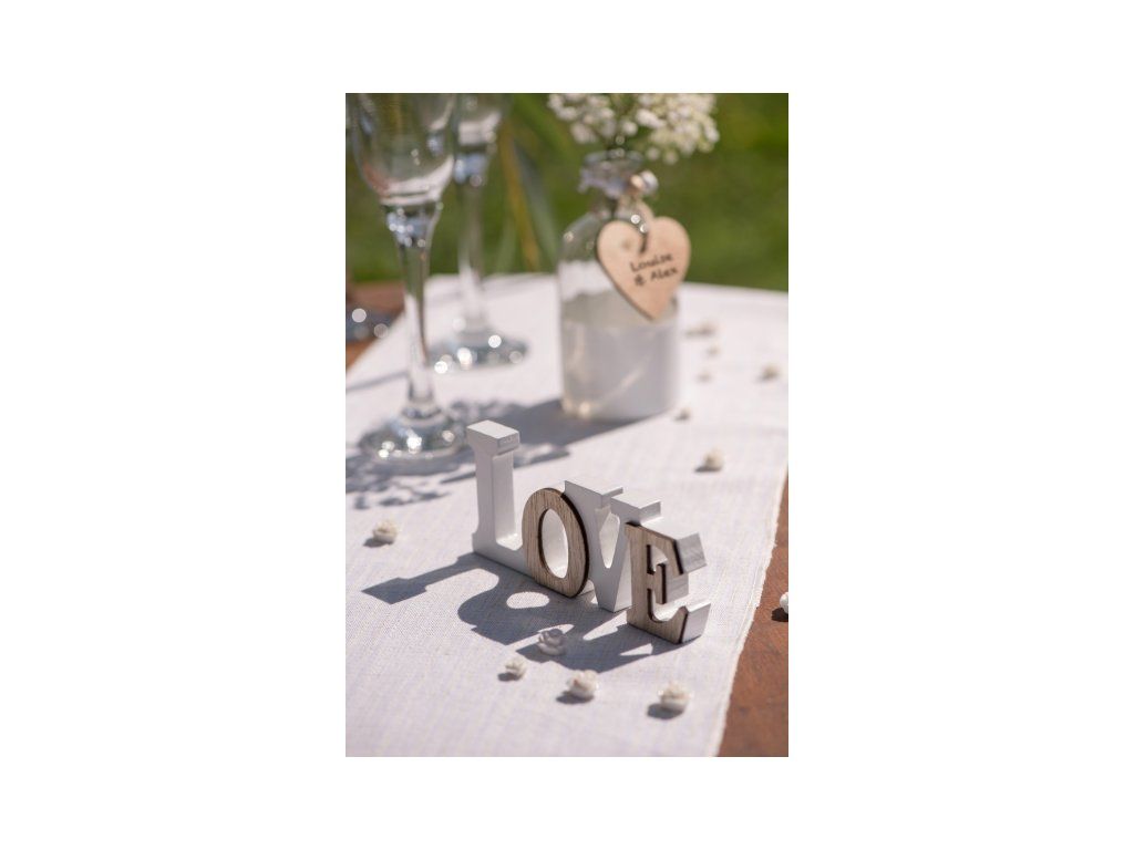 Semnul din lemn LOVE din lemn alb și maro este un decor de masă foarte frumos pentru o nuntă sau o petrecere de Ziua Îndrăgostiților.