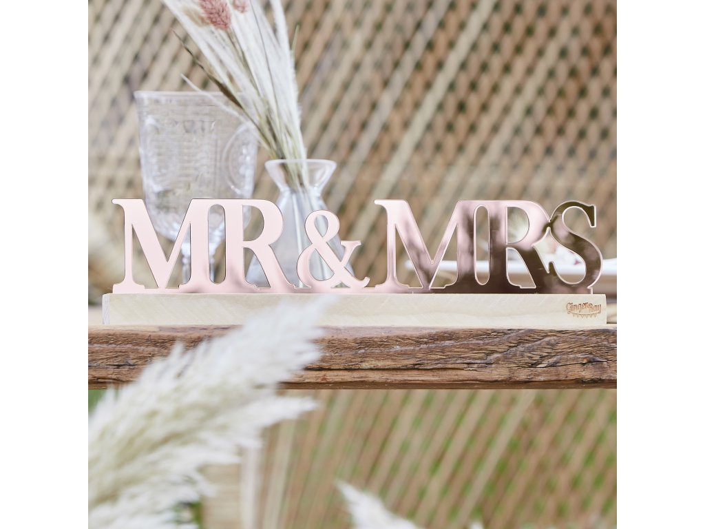 Decorațiunea din lemn cu inscripția MR & MRS este alegerea perfectă pentru masa de nuntă a tinerilor căsătoriți. Literele acrilice atașate pe o bază din lemn conferă un farmec modern acestei decorațiuni. Plasați această piesă decorativă oriunde doriți și aduceți un plus de eleganță atât mesei de nuntă, cât și interiorului casei D-voastră.