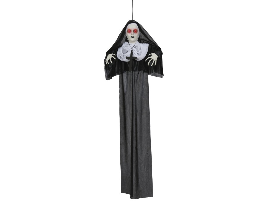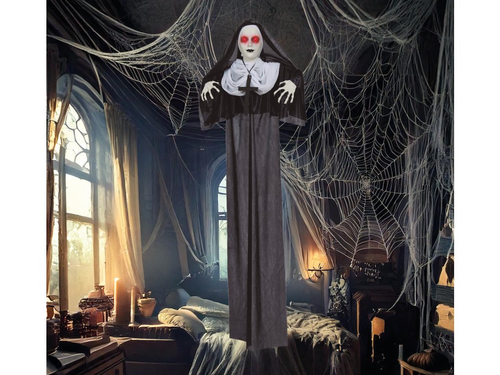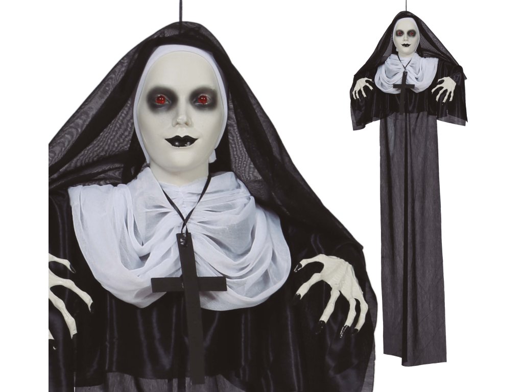 Pregătește-te pentru o porție sănătoasă de distracție și o atmosferă înfricoșătoare! Decorațiunea noastră suspendată sub formă de călugăriță de groază, cu o lungime de 120 cm, este accesoriul ideal pentru orice petrecere de Halloween, petrecere tematică sau pur și simplu atunci când vrei să surprinzi vizitatorii.