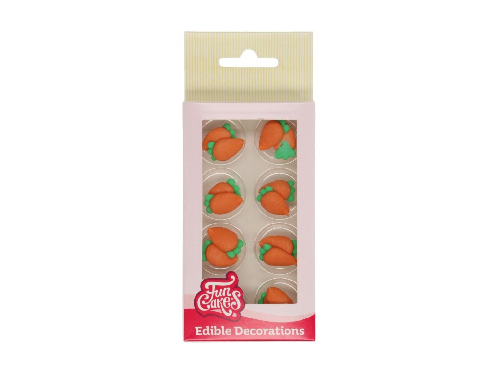 Cu decorațiunile din zahăr în formă de morcovi, veți putea înfrumuseța cu ușurință cupcakes, tartelete, brioșe și alte dulciuri, perfecte pentru deserturi de Paște și alte tematici festive. Aceste decorațiuni sunt ideale și pentru torturi acoperite cu pastă de zahăr colorată. Setul conține decorațiuni comestibile în formă de morcov.