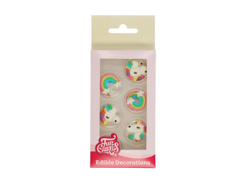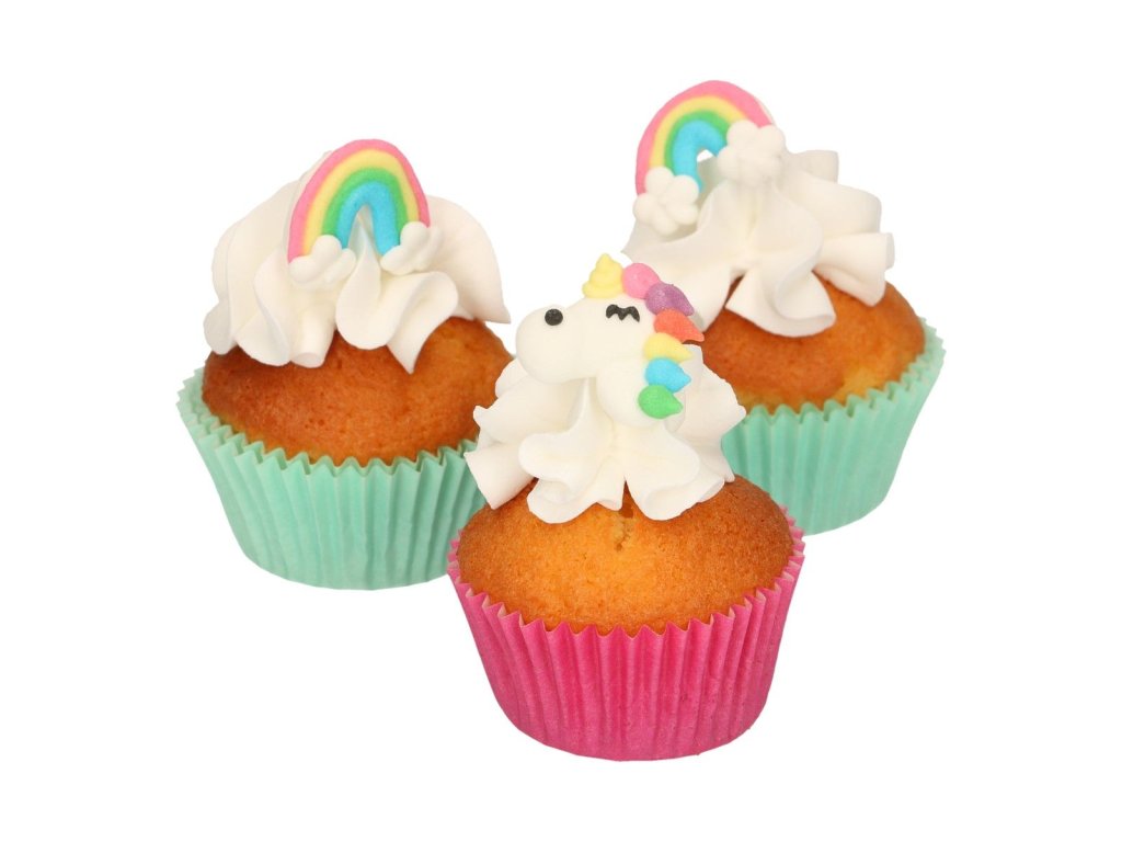 Decorațiunile cu Unicorn din zahăr sunt un decor popular pentru torturile, deserturile, brioșele și muffins pentru ziua de naștere a copiilor. Decorarea cu unicorni va încânta mulți iubitori ai acestui animal magic. Setul include 6 bucăți curcubeu și 6 bucăți unicorn. Produsul nu conține gluten.