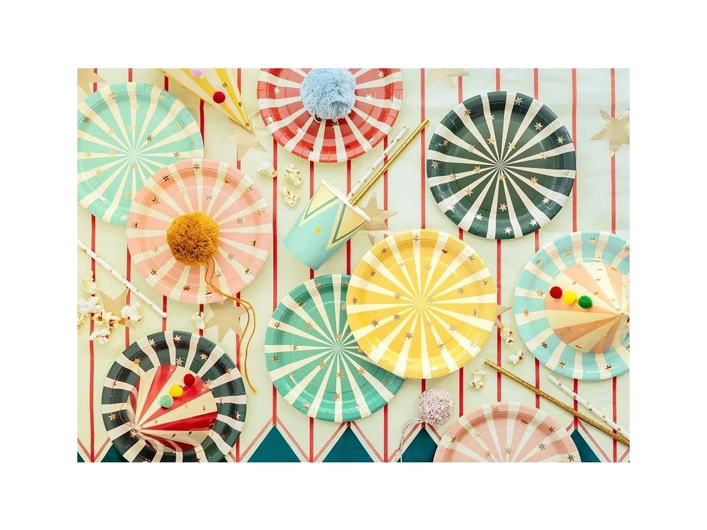 Învârteți un circ chiar pe masa voastră! Farfuriile de hârtie Cirkus (18 cm, 6 bucăți) sunt ca și create pentru o petrecere de ziua de naștere unde râsul răsună mai tare decât trompeta unui elefant. Fiecare farfurie este un acrobat colorat, gata să susțină tortul, prăjiturile și o grămadă de voie bună fără ezitare. Doar trebuie să le așezați pe masă și, dintr-odată, vă aflați în arenă, într-o lume plină de baloane, bucurie și magie. Cu aceste farfurii, chiar și o simplă felie de tort devine numărul principal al serii – atenție, să nu vă scape! Pregătiți-vă pentru o petrecere unde fiecare farfurioară este vedeta spectacolului de circ!