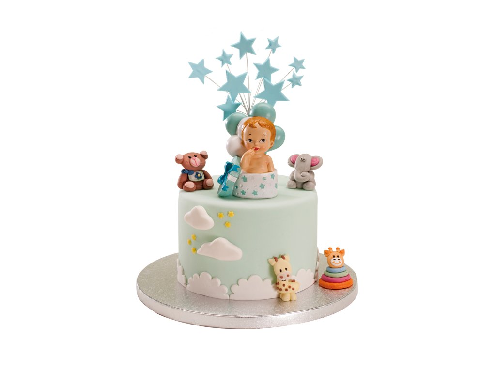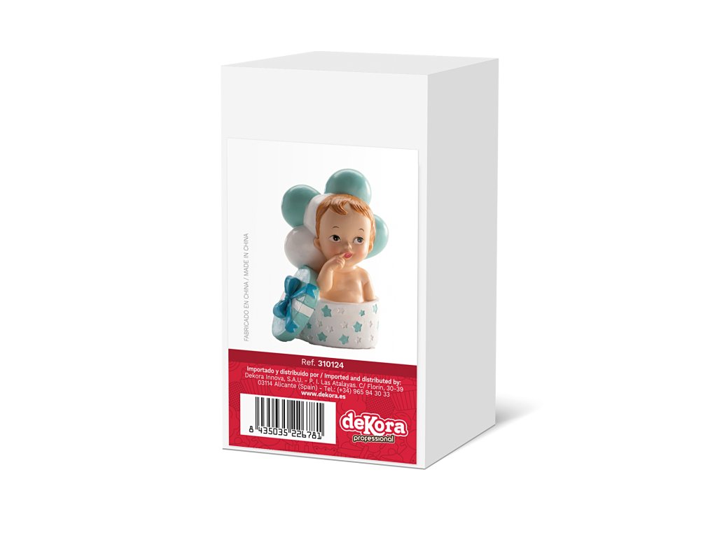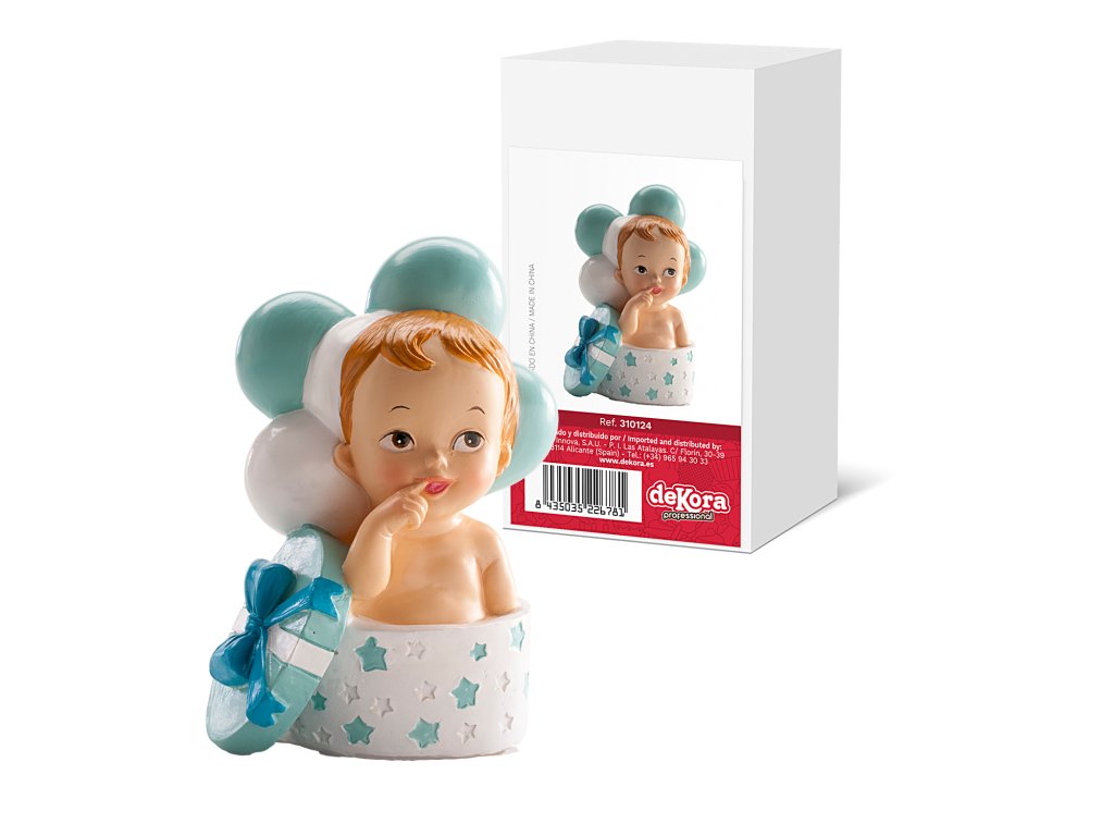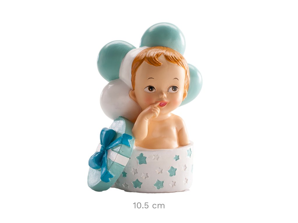 Figurină băiețel în cutie se potrivește pe tort cu ocazia botezului sau a nașterii bebelușului.