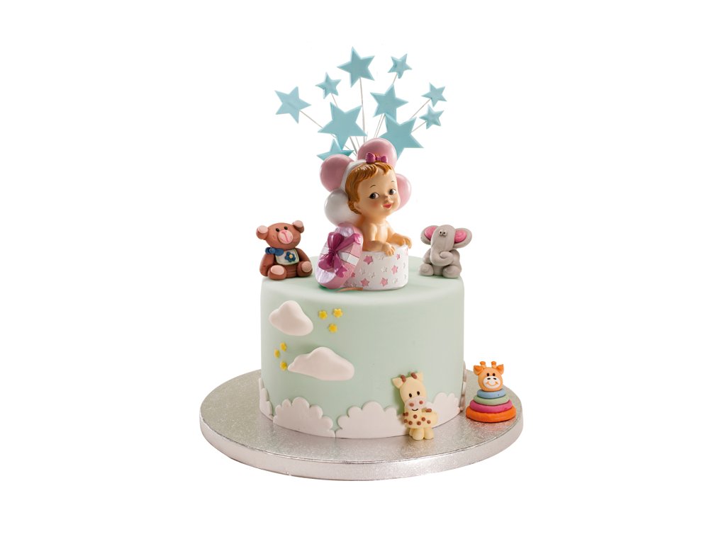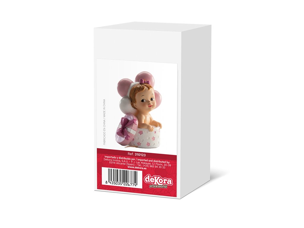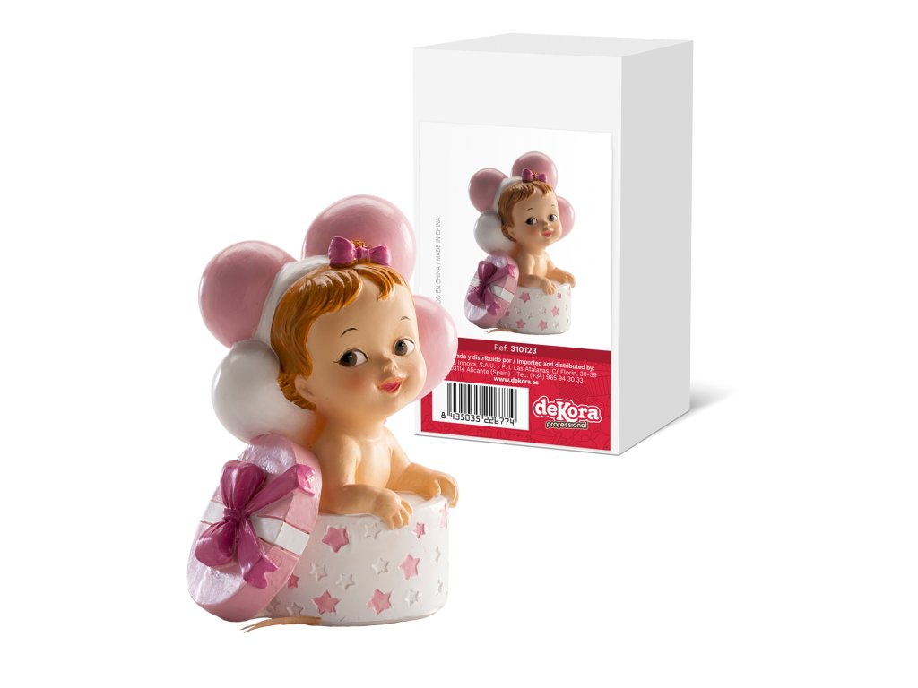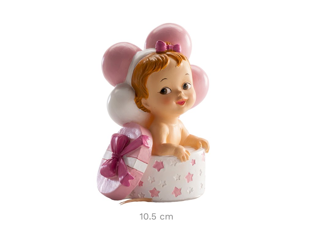 Figurină fetiță în cutie se potrivește pe tort cu ocazia botezului sau a nașterii unui bebeluș.