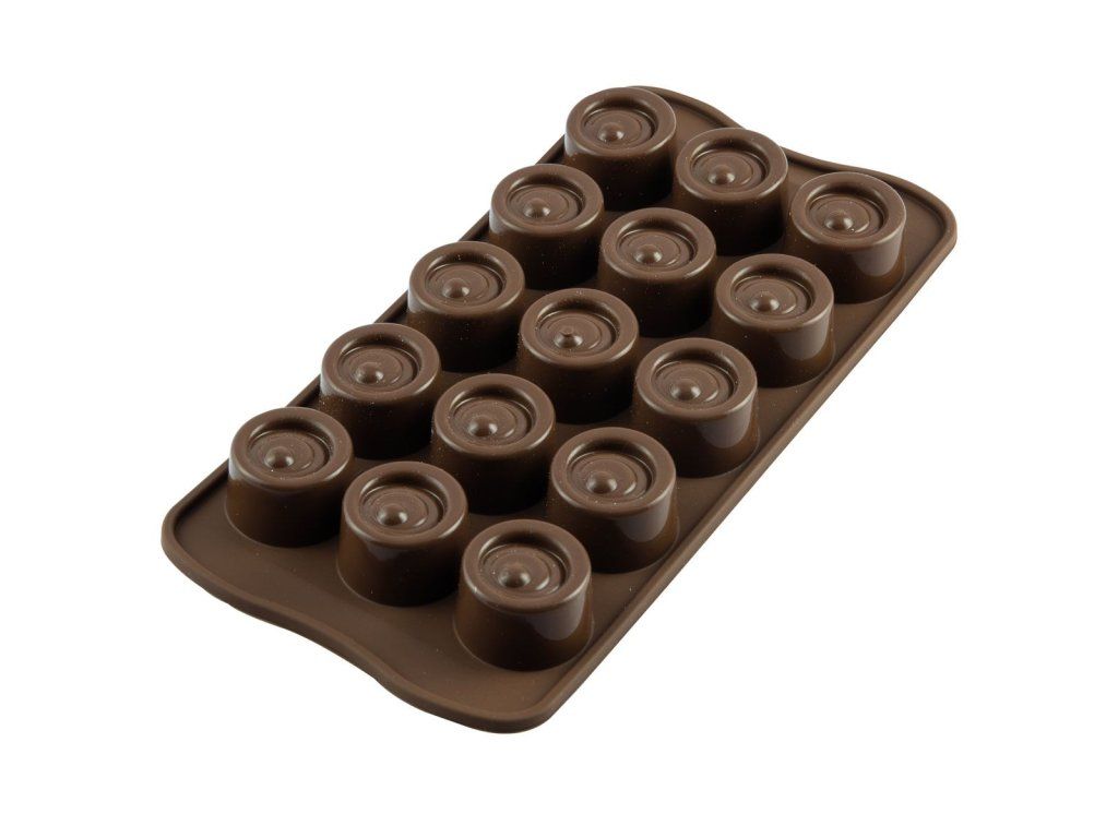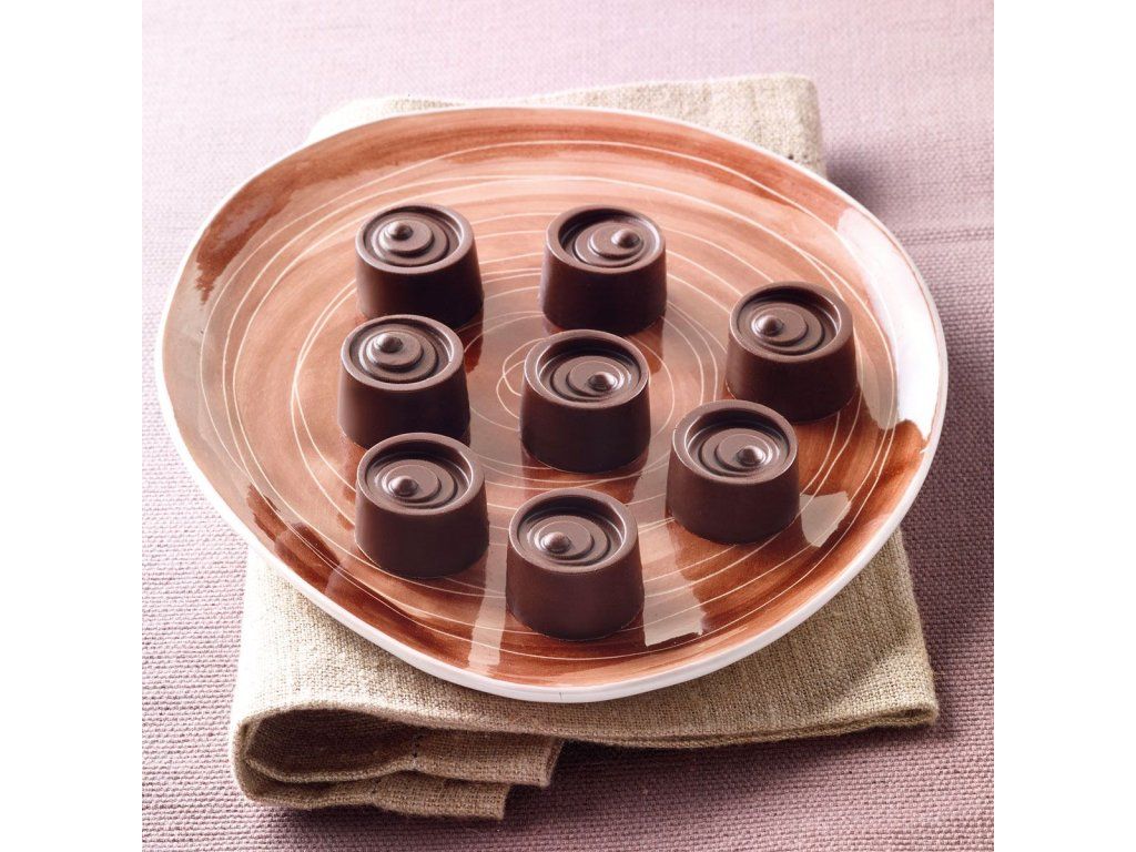 Topiți ciocolata albă sau neagră, turnați compoziția pregătită în formă, apoi lăsați-o să se întărească. Vă recomandăm să umpleți pralinele cu ganache de ciocolată. Datorită materialului din silicon, pralinele sunt ușor de îndepărtat din formă. În cele din urmă, puteți pulveriza pralinele cu un spray comestibil colorat.