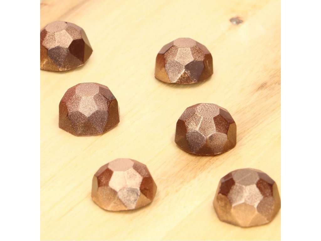 Topiți ciocolata albă sau neagră, aplicați umplutura pregătită sub marginea formei, lăsați să se întărească. Vă recomandăm să umpleți pralinele cu ganache de ciocolată. Datorita materialului din silicon, pralinele se scot ușor din matriță. Ulterior le puteți pulveriza cu un spray comestibil colorat.