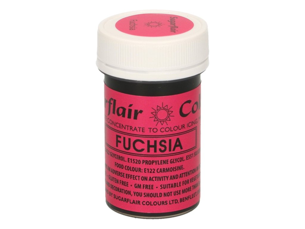 Colorant gel turcoaz Fuchsia, este o culoare concentrată potrivită pentru colorarea stratului sau pastei de modelaj. Colorant alimentar gel fuchsia este perfect pentru torturi cu tematică de Valentines. Produsul nu conține gluten, materii prime modificate genetic și este potrivit pentru vegani și vegetarieni.