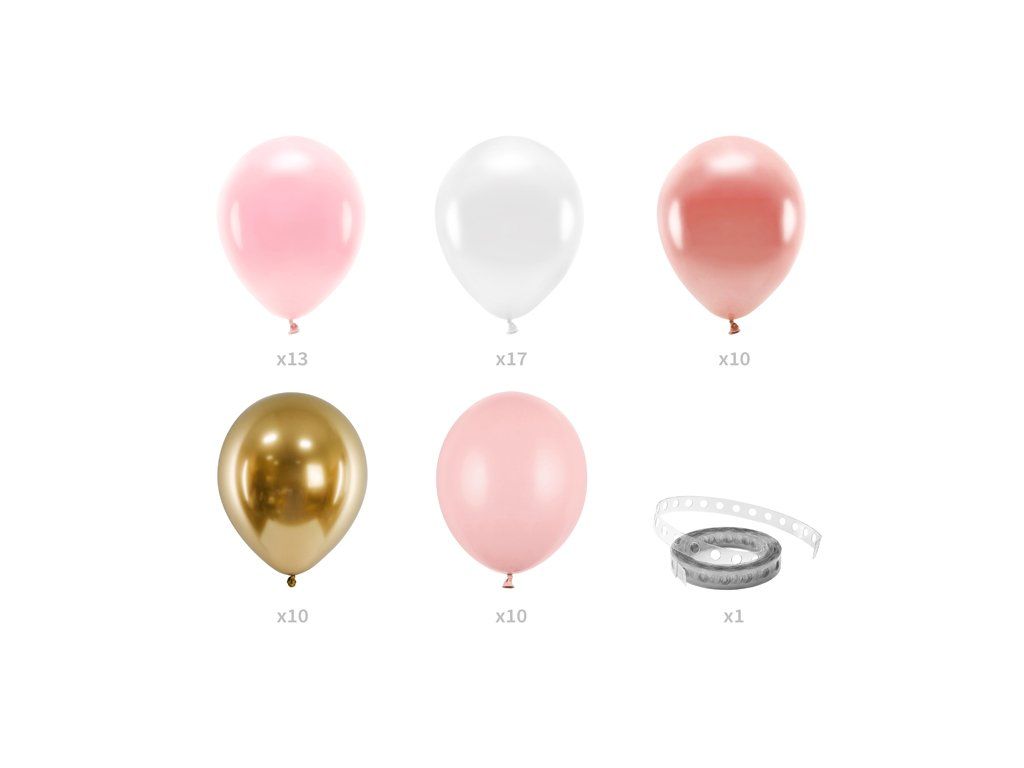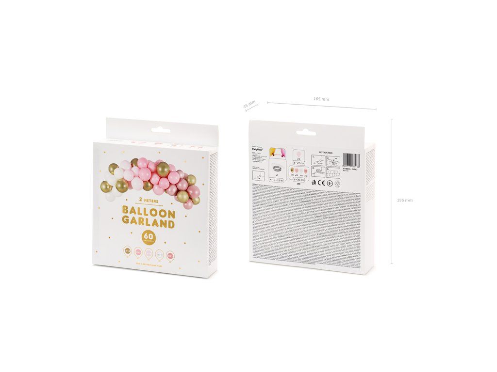 - conținut: 60 de baloane (10 x auriu, 10 x roz, 10 x roz-aurie, 10 x blush-roz, 13 x alb), 1 x ghirlandă translucidă (2,5 m)