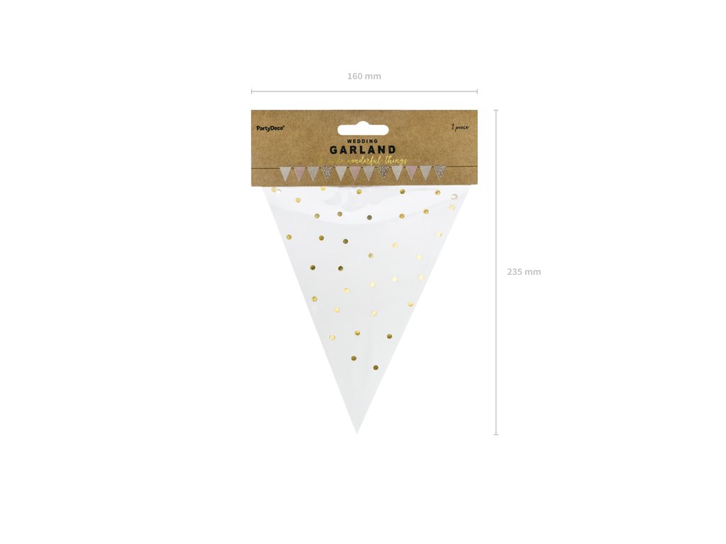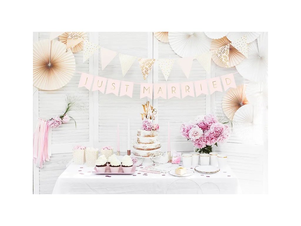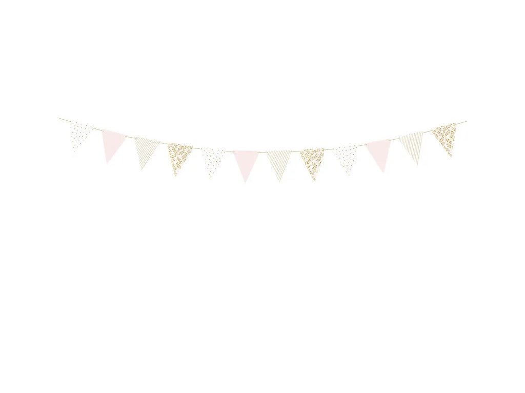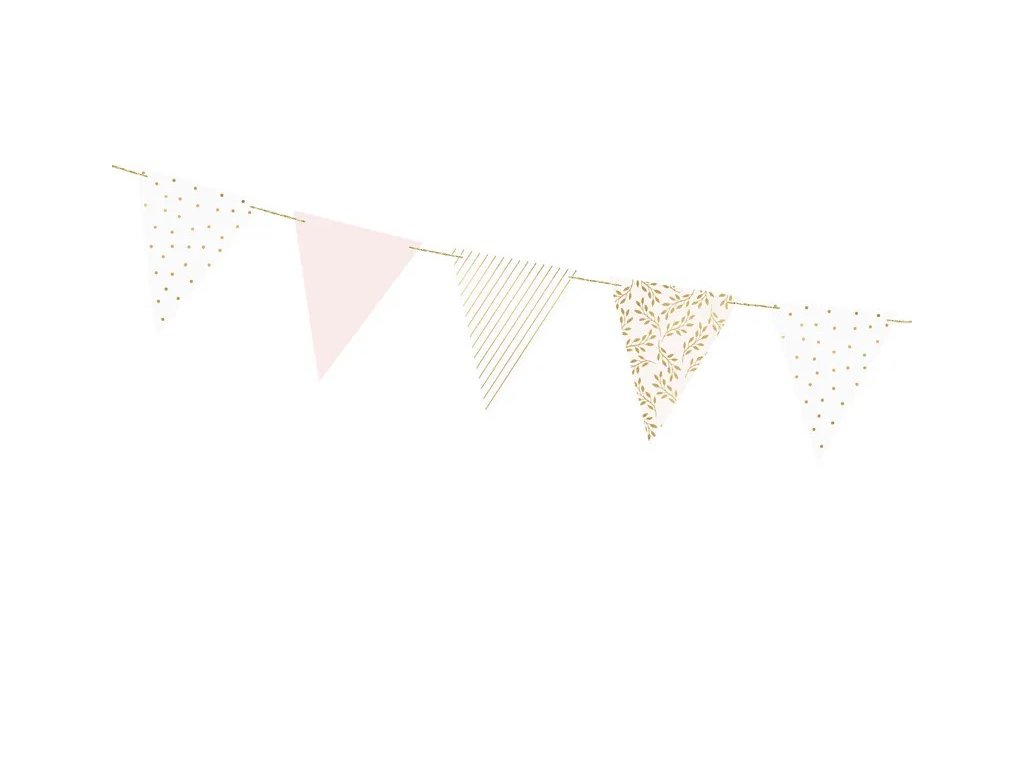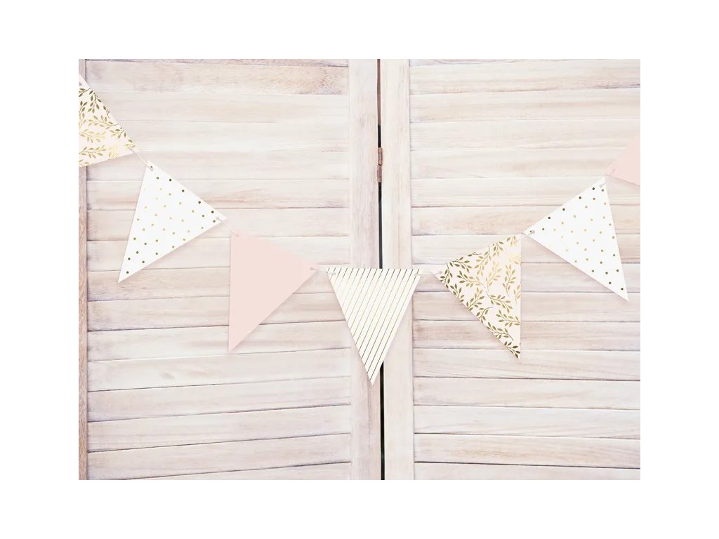 Doriți să organizați o petrecere? Atunci nu trebuie să vă lipsească acest banner, pe care se alternează stegulețe roz și albe cu motive aurii de frunze, buline și dungi. Acest banner va aduce zâmbetul pe fața nu doar a sărbătoritului, dar și a invitaților la petrecere.