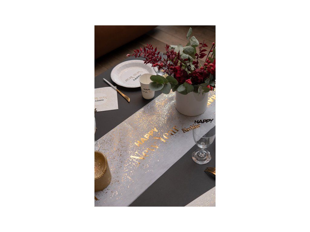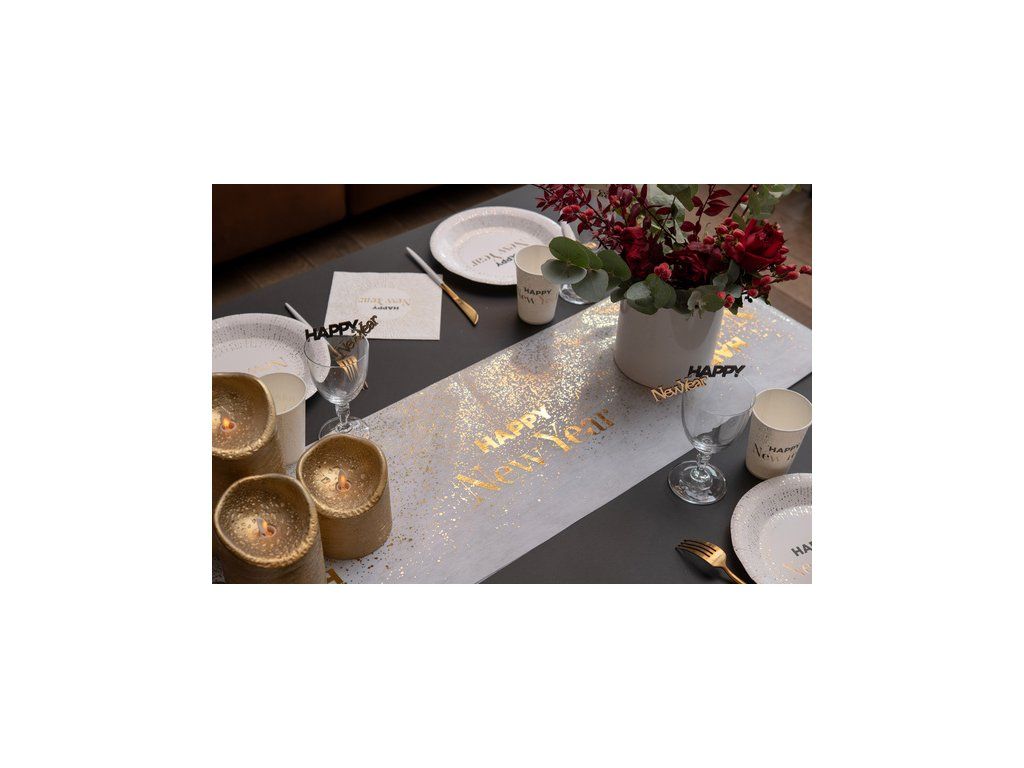 La fiecare petrecere trebuie să existe o masă aranjată original. Acest napron de masă festiv cu Happy New Year este perfect pentru o petrecere de Revelion.