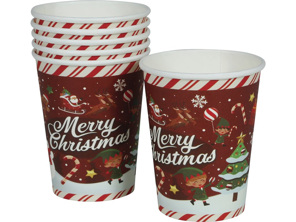 Înviorați-vă petrecerea de Crăciun cu aceste vesele pahare de hârtie Merry Christmas! Fiecare pachet conține 6 pahare cu volum de 240 ml – dimensiunea ideală pentru cacao fierbinte, punch de Crăciun sau băutură răcoritoare cu zmeură.