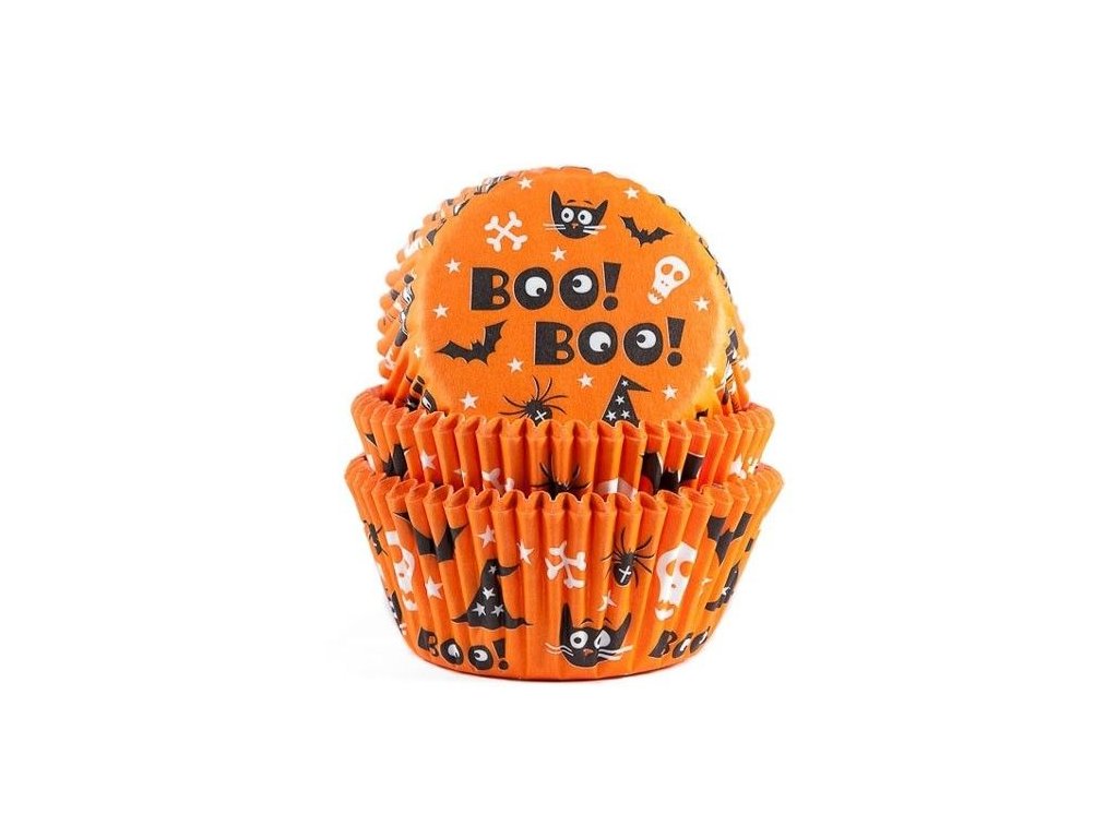 Puteți folosi coșulețe pentru copt cu imprimeu de Halloween în special atunci când pregătiți cupcakes sau brioșe înfricoșătoare. Deserturile vor completa perfect orice petrecere de Halloween.