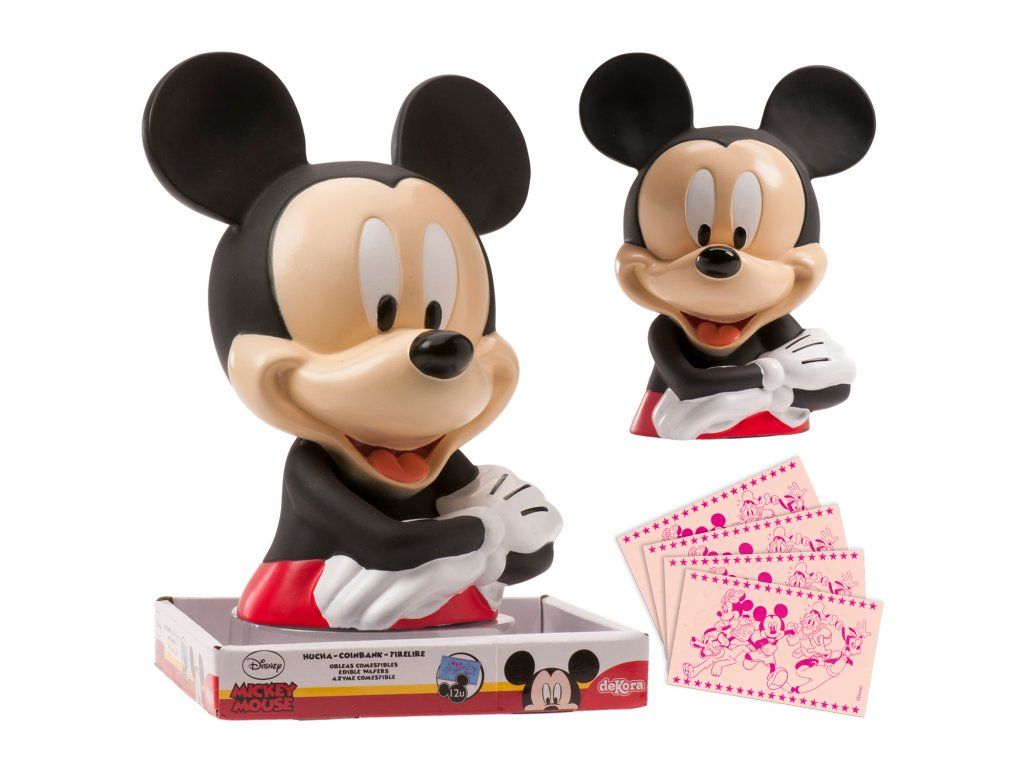 Cutia de bani Mickey Mouse va fi locul perfect pentru a economisi și a stoca primii bani. Caseta de bani va decora tortul aniversar al copiilor si ulterior interiorul camerei copiilor.
