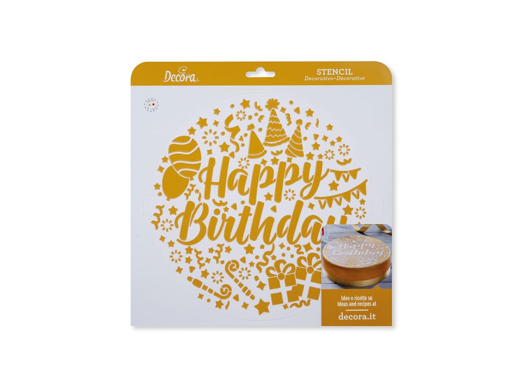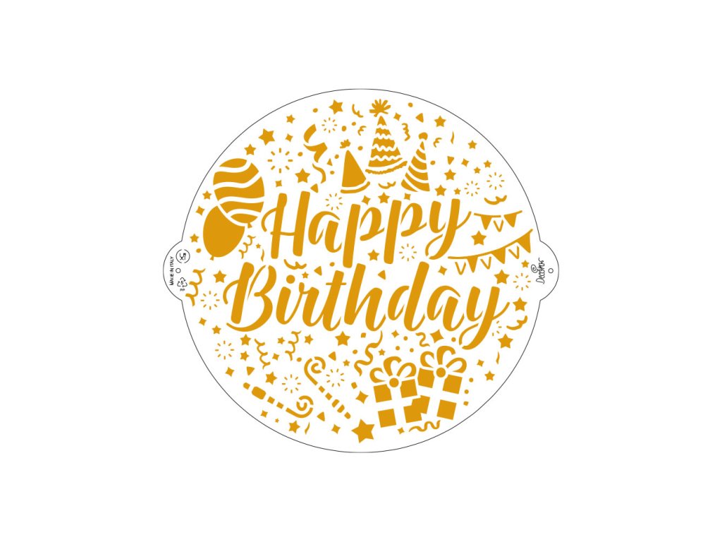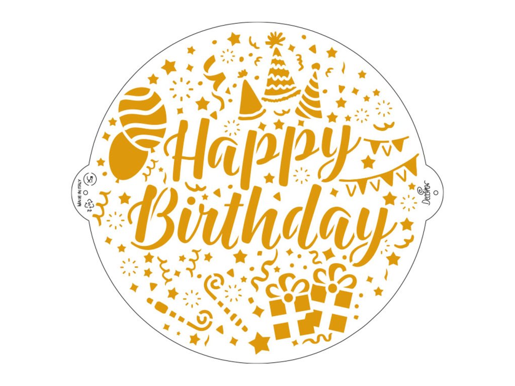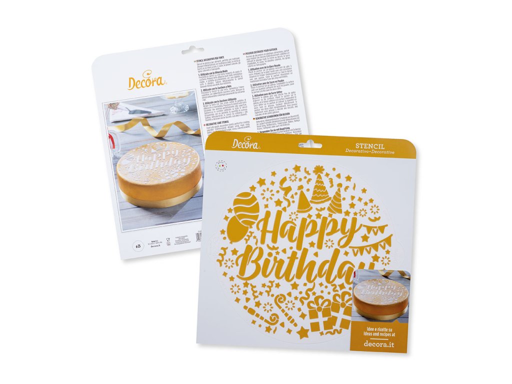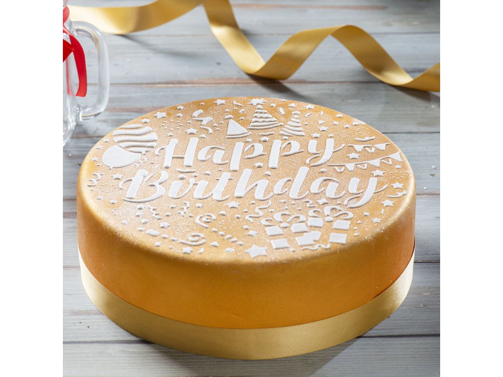 Șablonul practic Happy Birthday creează o decorațiune delicată pe suprafața tortului sau a desertului. Datorită manipulării ușoare, are o gamă largă de utilizări. Șablonul pentru cofetărie este ideal pentru prepararea și decorarea deserturilor pentru aniversări. Cu șablonul veți obține o decorare fină, elegantă pentru produse de cofetărie.