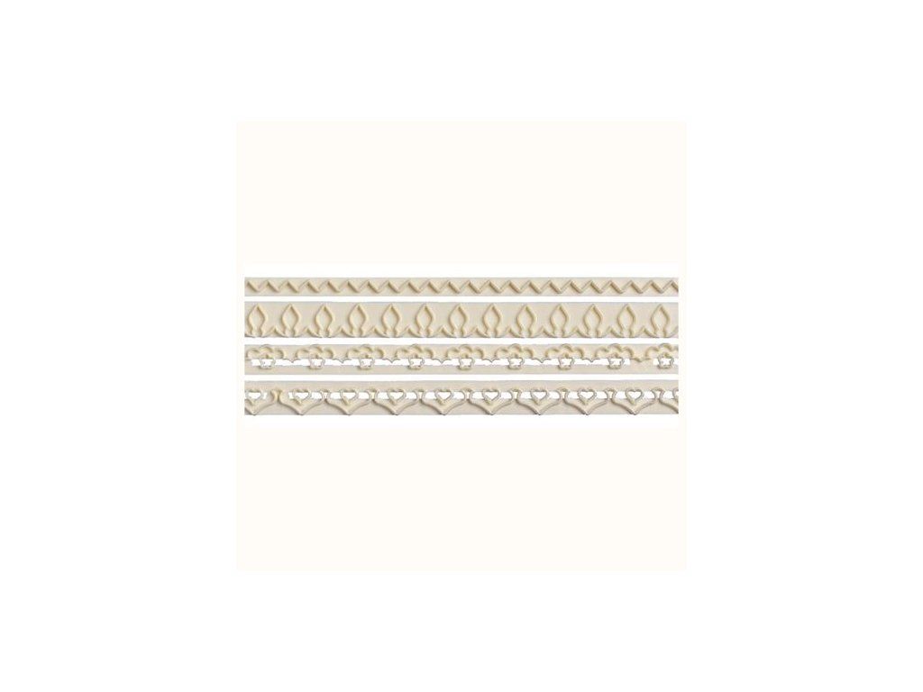 Setul de mulaje este un instrument practic și în același timp decorativ pentru a face ca prăjiturile să arate ca niște opere de artă. Cu setul puteți decora de ex. marginile și circuitele tortului le conferă un aspect artistic original. Setul conține 4 bucăți de mulaje. Vă recomandăm să folosiți mulajele pentru prăjituri acoperite cu fondant.