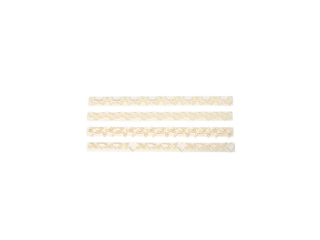 Setul mulaje este un instrument practic și în același timp decorativ de cofetărie pentru a face ca prăjiturile să arate ca niște opere de artă. Cu setul puteți decora de ex. marginile și circuitele tortului le conferă un aspect artistic original. Setul conține 4 bucăți de mulaje. Vă recomandăm să folosiți mulajele pentru torturi acoperite cu fondant. Setul conține 4 variante diferite: inimi, stele de mare, fluturi și nasturi.