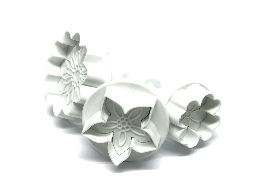 Setul de decupatoare cu ejector conține 3 dimensiuni de flori. Decupatoare cu ejector creează decorațiuni originale din fondant care completează suprafața tortului sau a deserturilor. Datorită ejectorului, manipularea este ușoară.