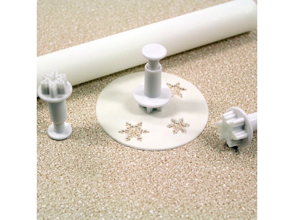 Setul conține 3 decupatoare de diferite dimensiuni în formă de fulg de zăpadă. Dacă pregătiți o petrecere de ziua copiilor în stilul basmului Frozen, acest set vă va fi de ajutor și vă va ajuta să creați decorațiuni pe tortul de basm. Decorarea este potrivită și pentru torturile de Crăciun, cupcakes și alte deserturi. Puteți decupa fulgi din fondant, aluat și pastă de gumă.