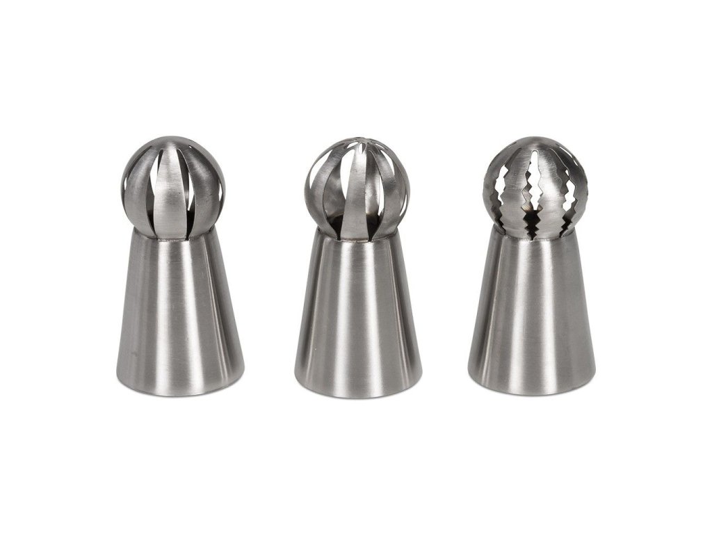 Cu acest set de trei duze decorative originale, puteți crea cu ușurință elemente decorative din ciocolată, unt, cremă colorată și frișcă. Rezultatul corect stă într-o cremă fără bulgări și cu o consistență fermă. Duzele rusești sunt potrivite pentru decorarea cupcakes-urilor, torturilor, prăjiturilor și altor deserturi. Acestea sunt fabricate din oțel inoxidabil.