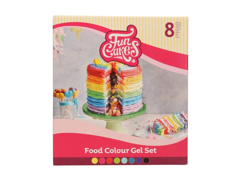 Un set complet de culori, destinat în special pentru torturi elegante sau de nuntă. Setul conține 8 culori - galben, roz, roșu, albastru deschis, verde, aqua, violet și negru. Acestea sunt ideale pentru colorarea maselor de modelat și acoperire și pentru toate alimentele pe bază de apă.