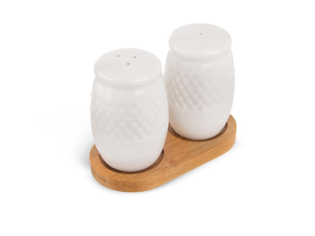 Set pentru condimente din portelan alb cu suport din lemn de bambus.