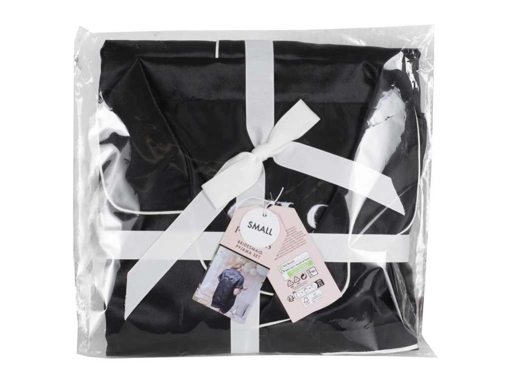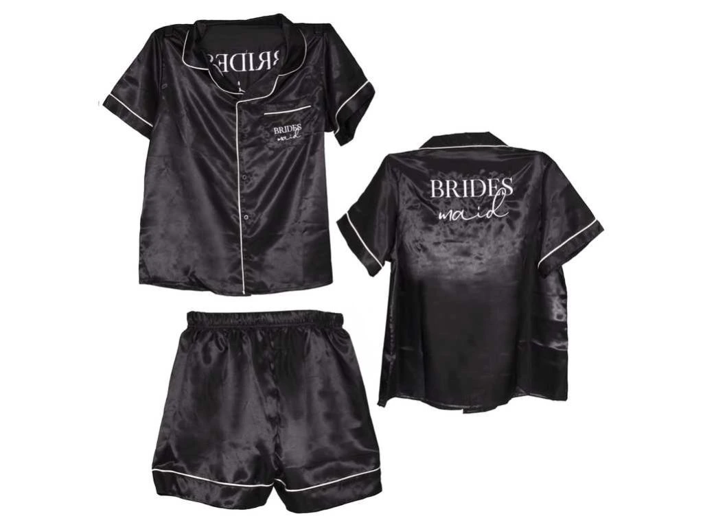 Pijamaua de lux din două piese de culoare neagră cu tiv alb frumos, guler și o închidere cu nasturi. Are brodat "Bridesmaid" pe partea din față și pe spate. Bluza are mâneci scurte, la fel ca și pantalonii. Pijamaua este confecționată dintr-o țesătură neagră netedă și moale la atingere pe piele. Această pijama superbă este realizată pentru a vă face să arătați și să vă simțiți minunat la petrecerea burlăcițelor cu cele mai bune prietene, dar și după o puteți îmbrăca și o să vă amintiți cu drag de acea seară frumoasă.