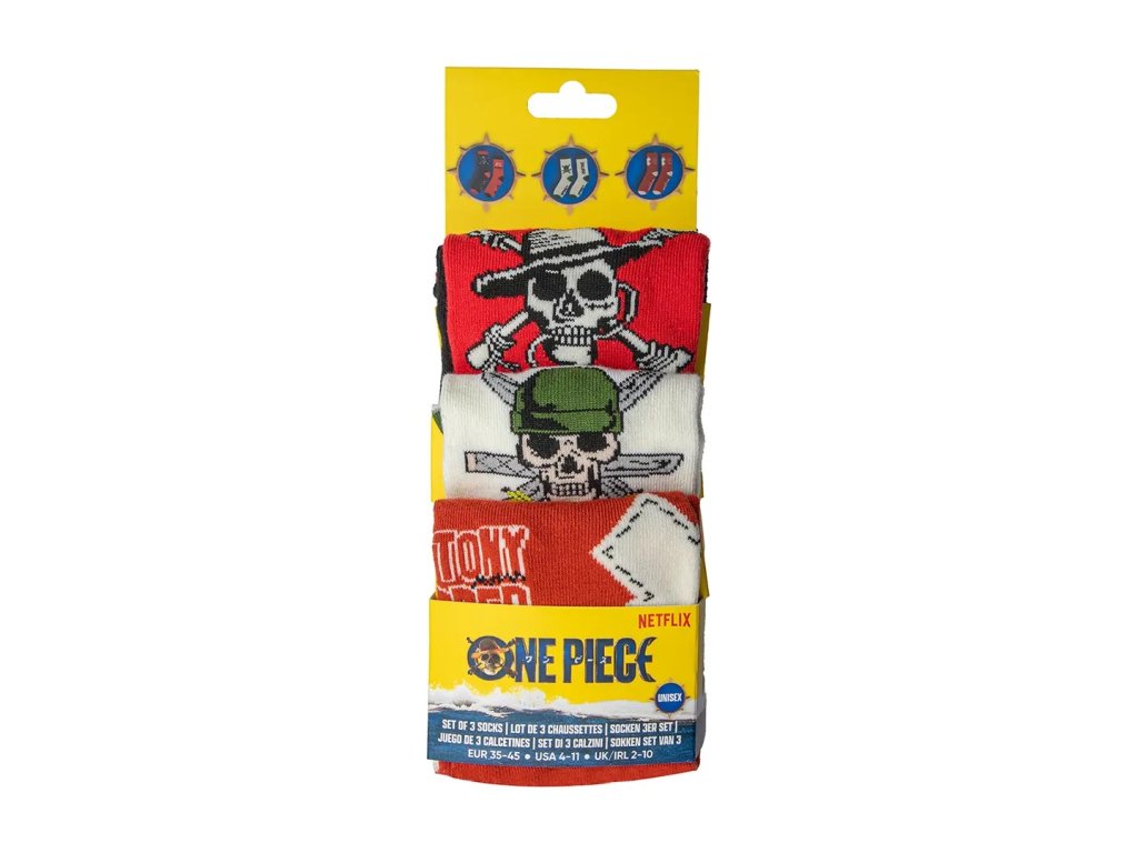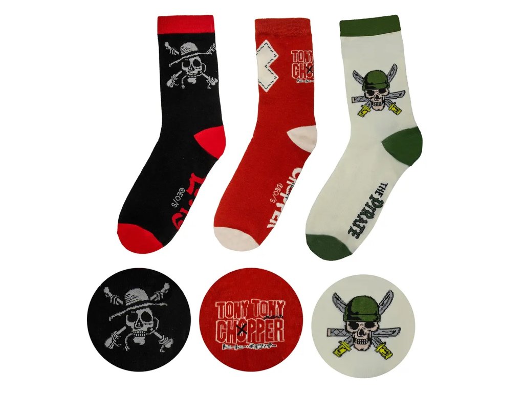 Setul de șosete cu un design inspirat din One Piece este accesoriul ideal pentru orice fan al acestui serial popular. Șosetele confortabile și moi vor înveseli orice ținută și vor aduce o notă de aventură în viața de zi cu zi. Datorită materialului plăcut, sunt potrivite pentru purtarea pe tot parcursul zilei, fie la școală, la muncă sau în timpul liber. O alegere grozavă atât ca și cadou, cât și ca accesoriu practic pentru colecția ta de produse pentru fani.
