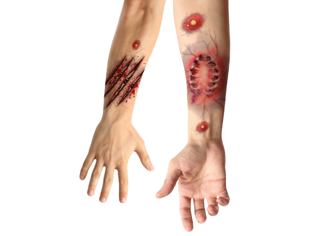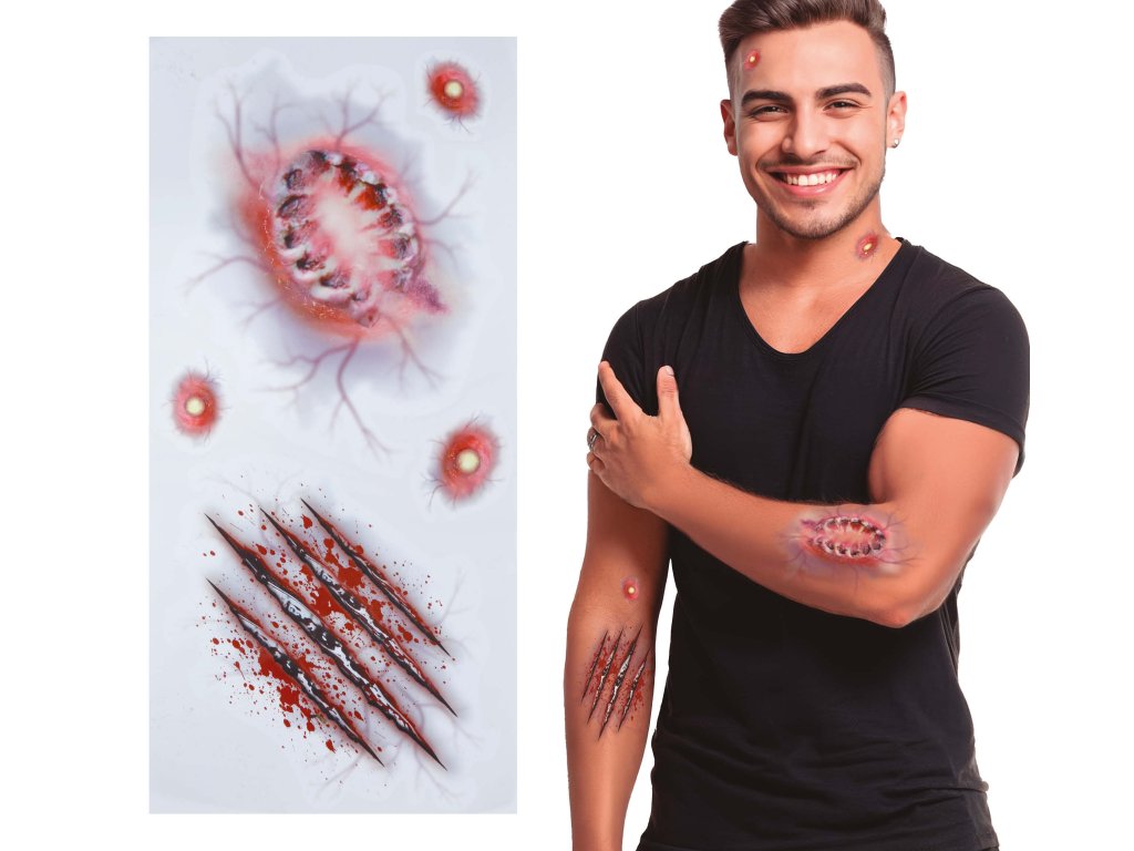 De asemenea, costumul D-voastră de carnaval sau de Halloween poate părea mai credibil datorită diverselor accesorii, cum ar fi tatuajele cu răni. Acest accesoriu se potrivește pentru diverse costume de carnaval, bineînțeles că lăsăm utilizarea lui la latitudinea imaginației D-voastră.