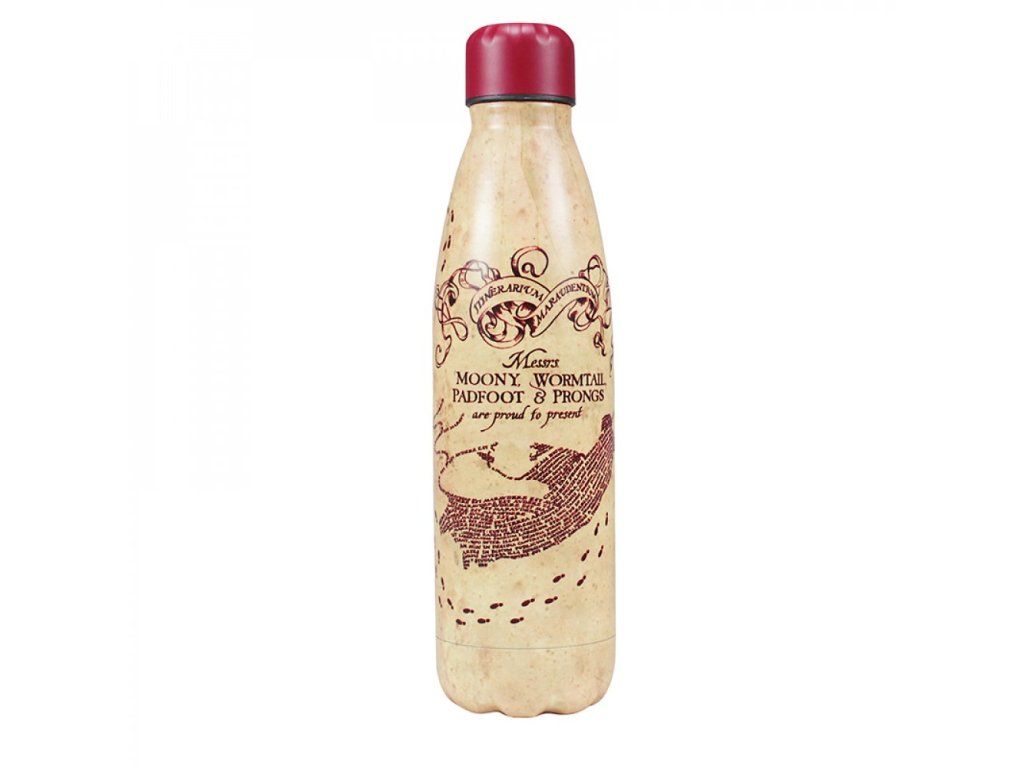 Această sticlă metalică este modalitatea perfectă de a rămâne hidratat în timp ce scrieți planuri pentru a salva elfii casei sau pentru a vă pregăti pentru testele de vrăji. Sticla este fabricată din oțel inoxidabil cu logo-ul Harta Ștrengarilor.