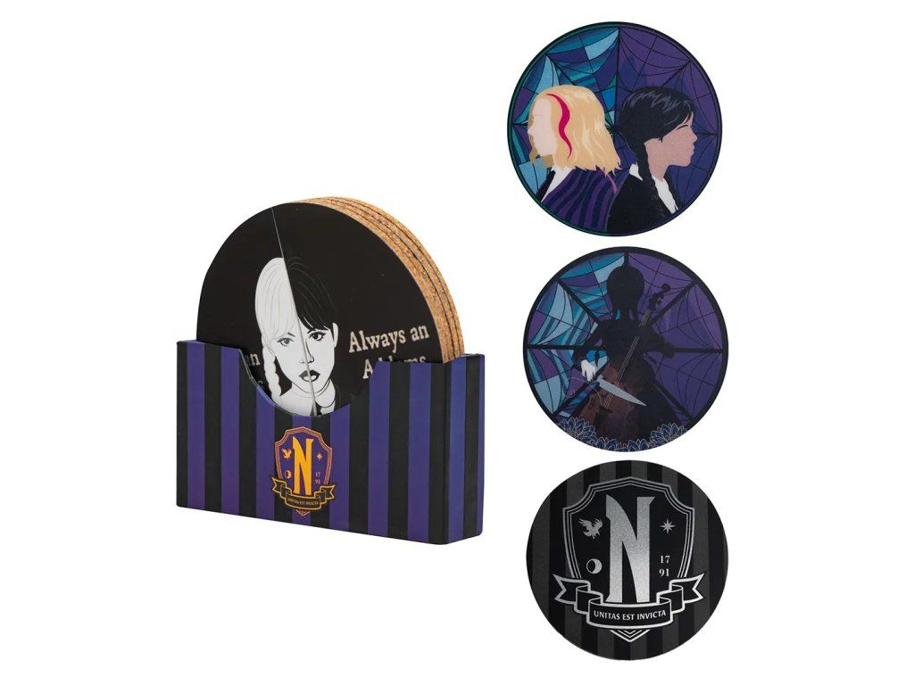 Setul conține patru suporturi de pahare cu motivul cunoscutului serial Wednesday. Suporturile de pahare imprimate vor fi cadoul perfect pentru fanii serialului.