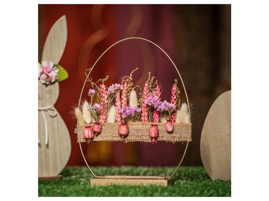 Pregătiți-vă pentru Paște cu un suport metalic pe bază de lemn, în formă de ou. Acest suport elegant este perfect pentru expunerea decorațiunilor de Paște sau a fotografiilor preferate. Combinația dintre inelul metalic și baza naturală din lemn aduce un aspect modern și stilat, care va înfrumuseța casa D-voastră în timpul sărbătorilor.