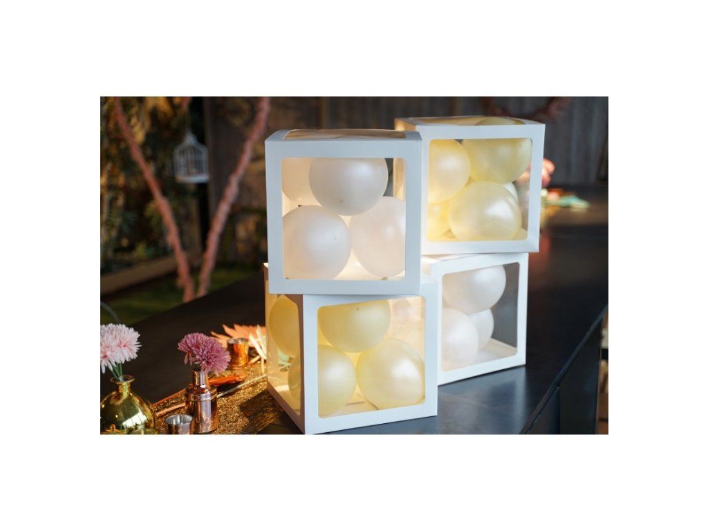 Un suport ingenios pentru baloane în formă de cuburi cu deschideri transparente, care vă ajută să creați o decorare originală pentru petreceri de naștere sau baby shower.