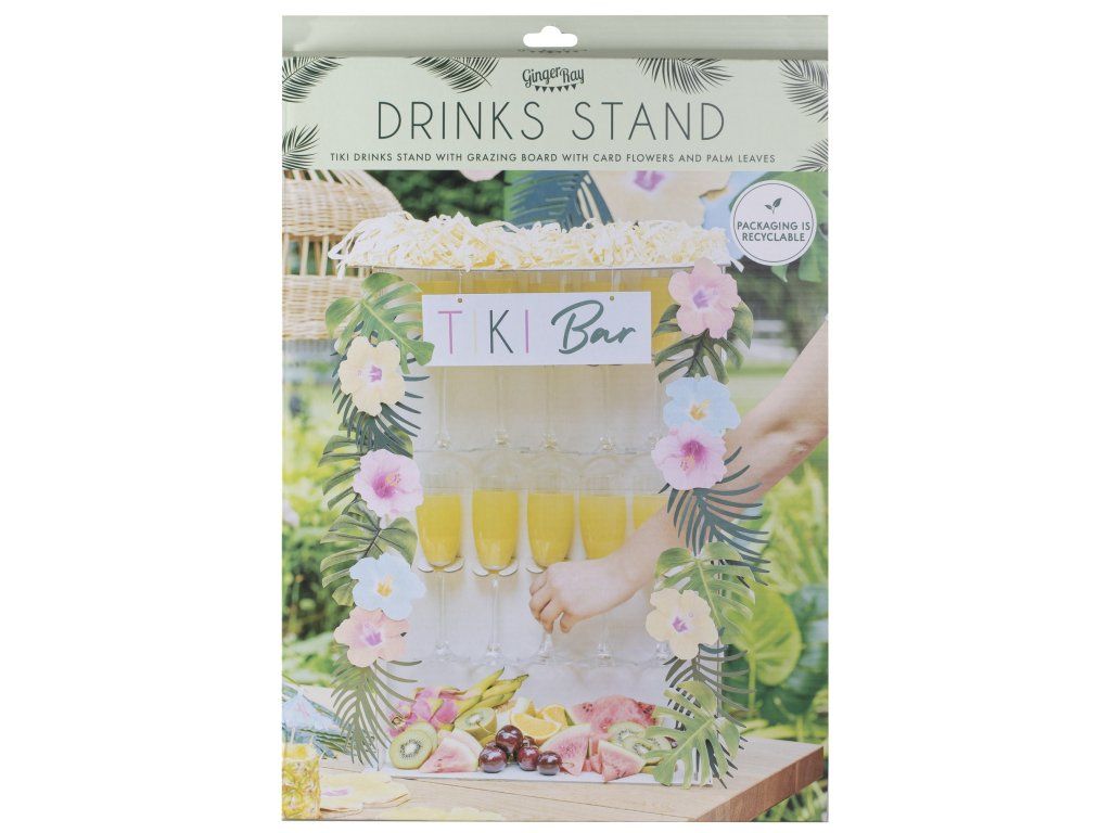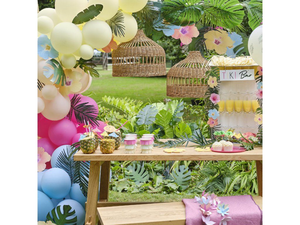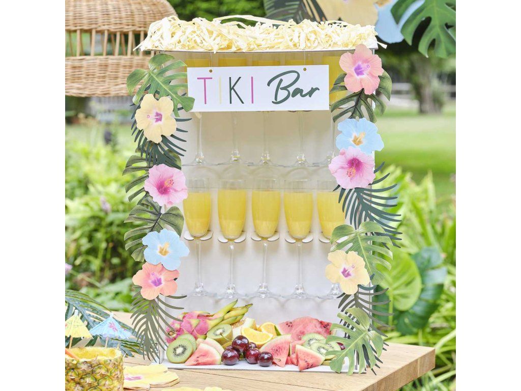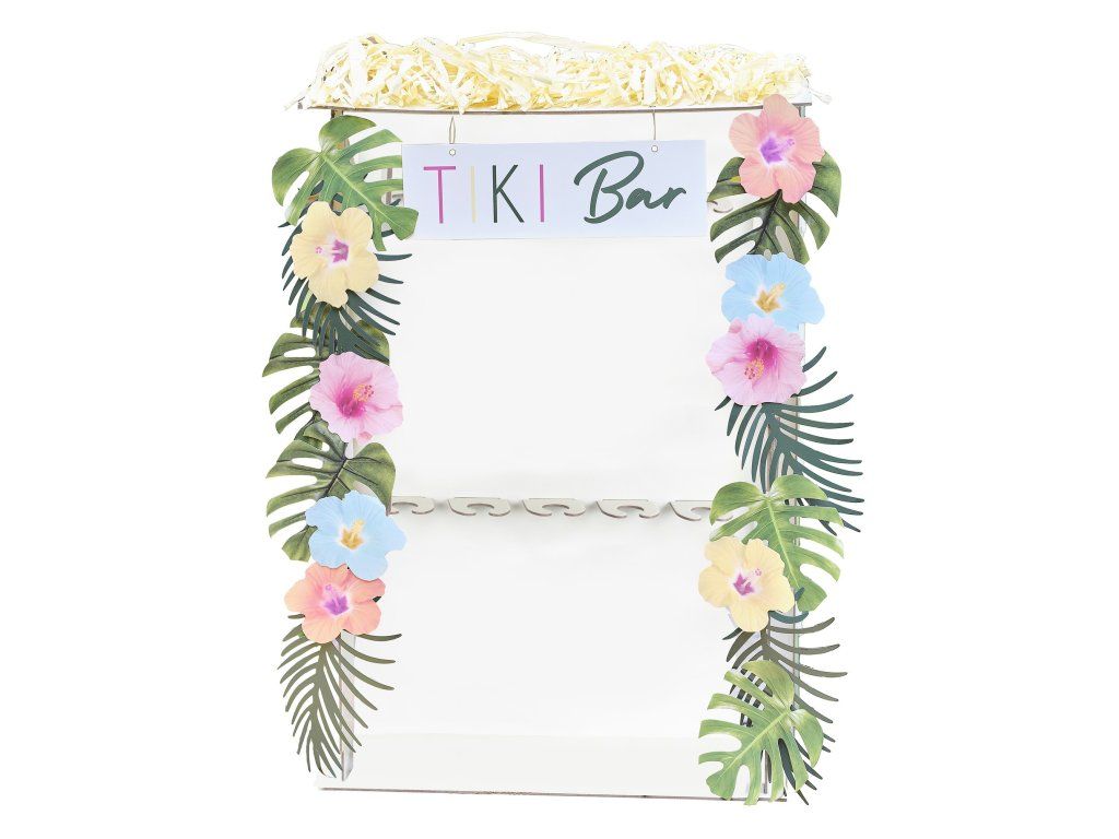 Cu drag vă prezentăm acest Tiki Bar - locul unde se întâlnesc băuturi excelente, arome tropicale și o atmosferă superbă de vacanță. Acest stand este decorat în partea superioară cu o tăbliță suspendată inscripționată cu „TIKI BAR”. Pachetul include și 8 flori exotice colorate și 10 frunze tropicale pentru decor. Tiki Bar-ul are 10 suporturi pentru pahare și este un accesoriu indispensabil pentru petrecerea dvs., care va fi adorat de toți invitații!